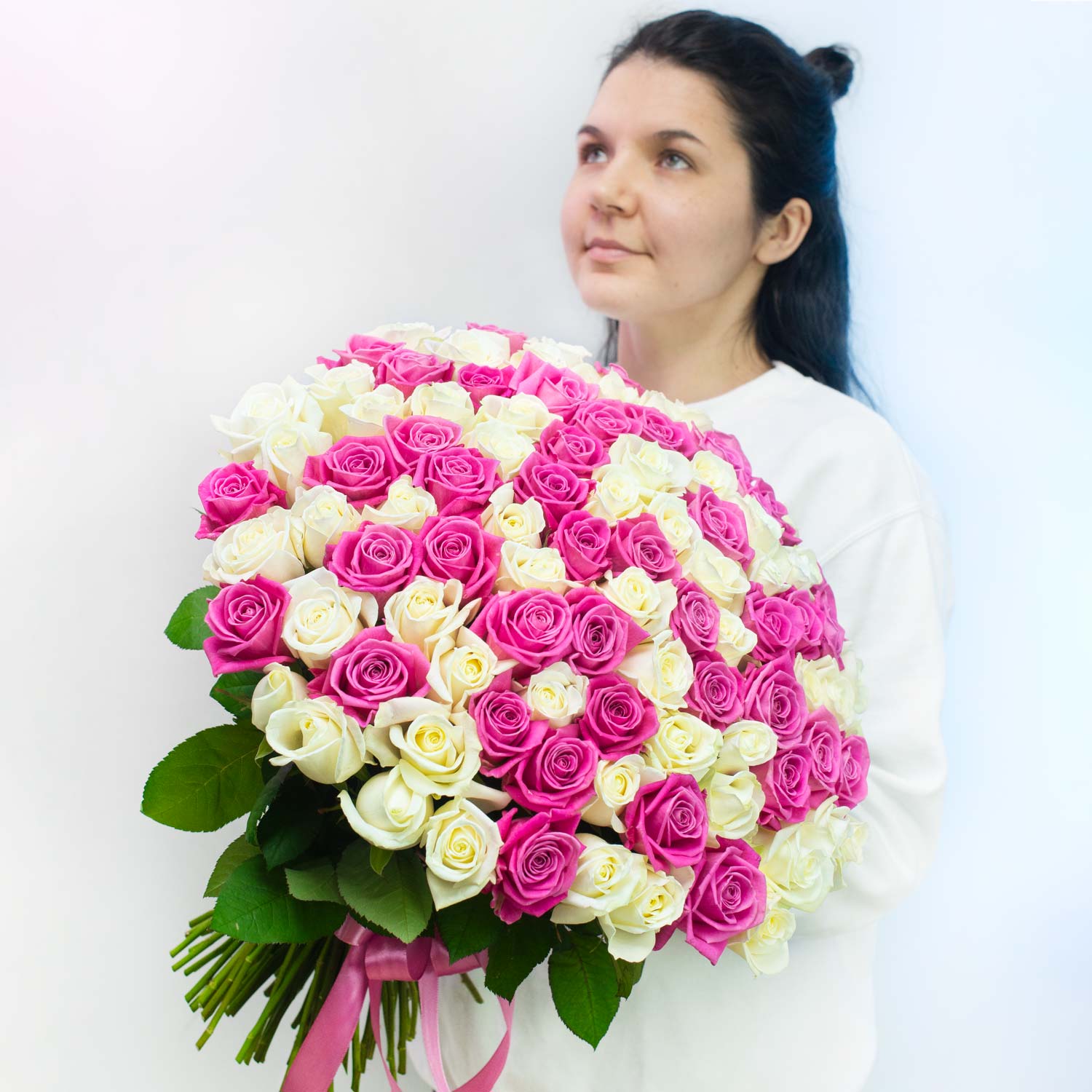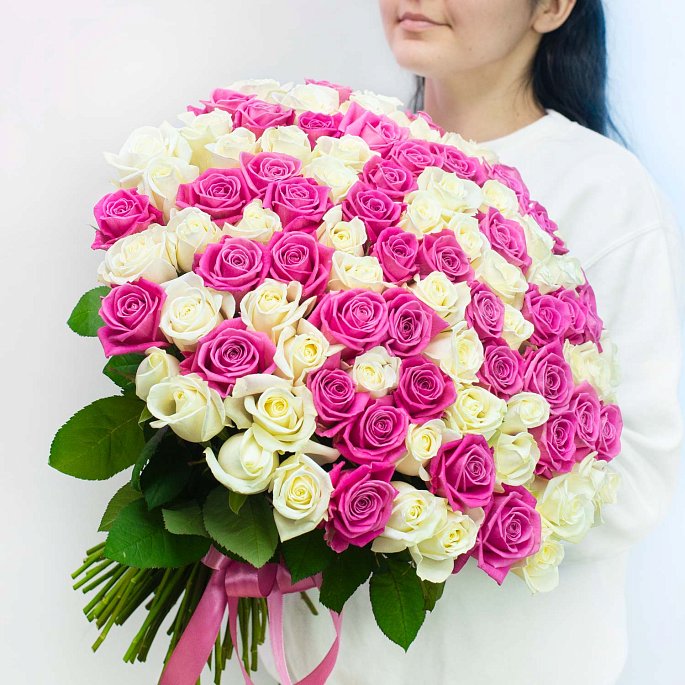Букет из 101 белой и розовой розы 60 см Россия.Загадочная, неповторимая красота воплощена в букете из 101 белой и розовой розы, где чувственность и нежность сливаются в роскошное цветочное пиршество!
