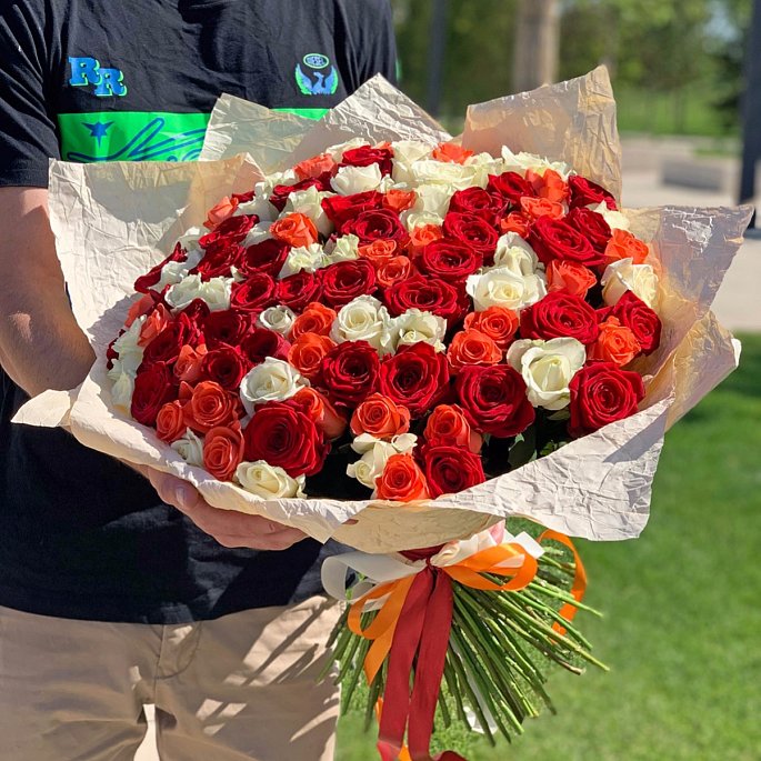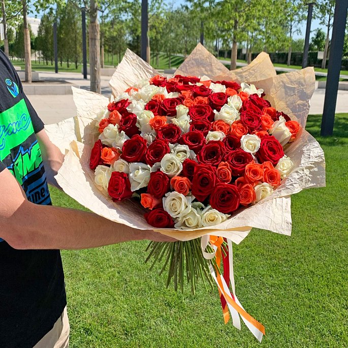 Букет из 101 розы "Микс №1" - красные розы "Ред Наоми", белые розы "Аваланж", оранжевые розы "Вау"Примерный размер букета: 60*60 см