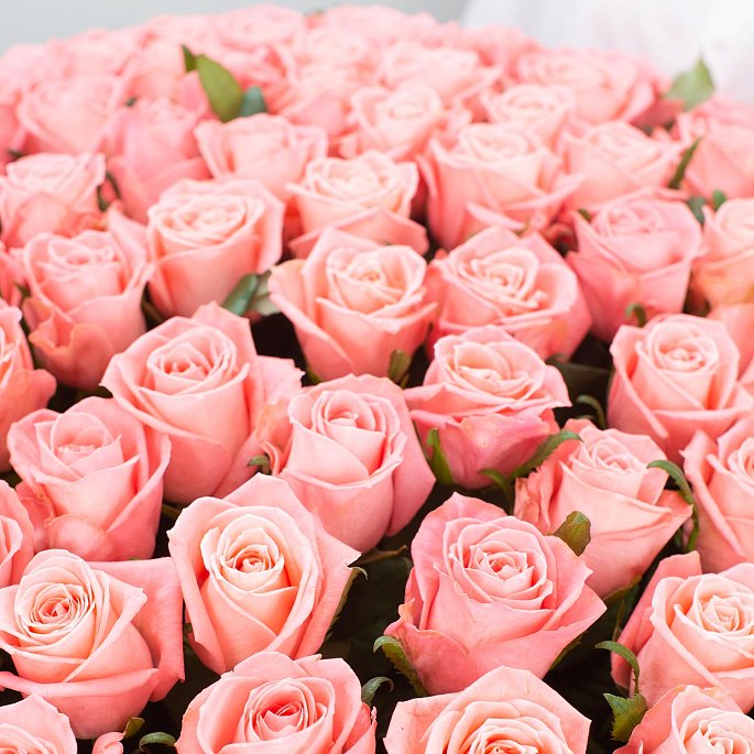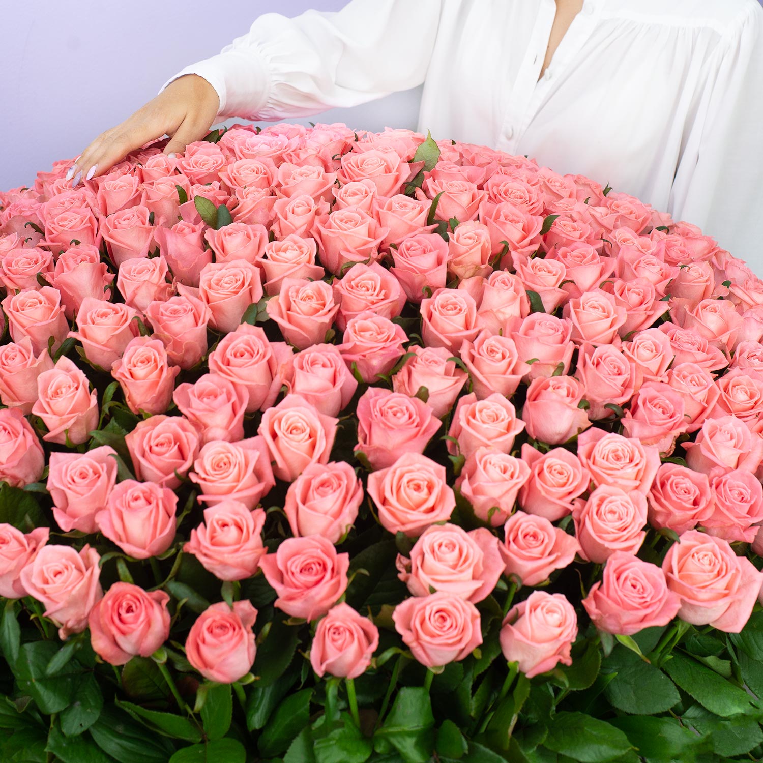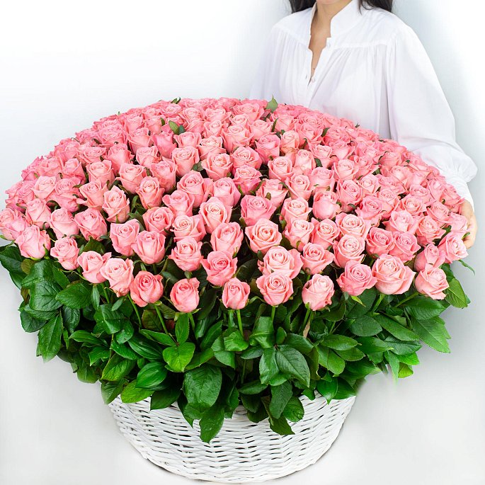 Очень большая корзина из нежных розовых роз с коралловым оттенком. Отличная густота зелени, плотный бутон.Примерный диаметр корзины: 100-110 см
