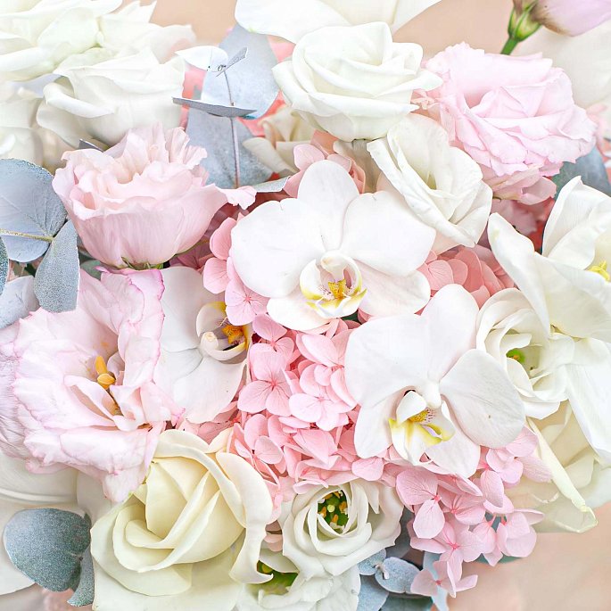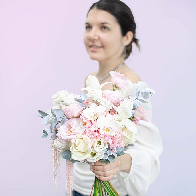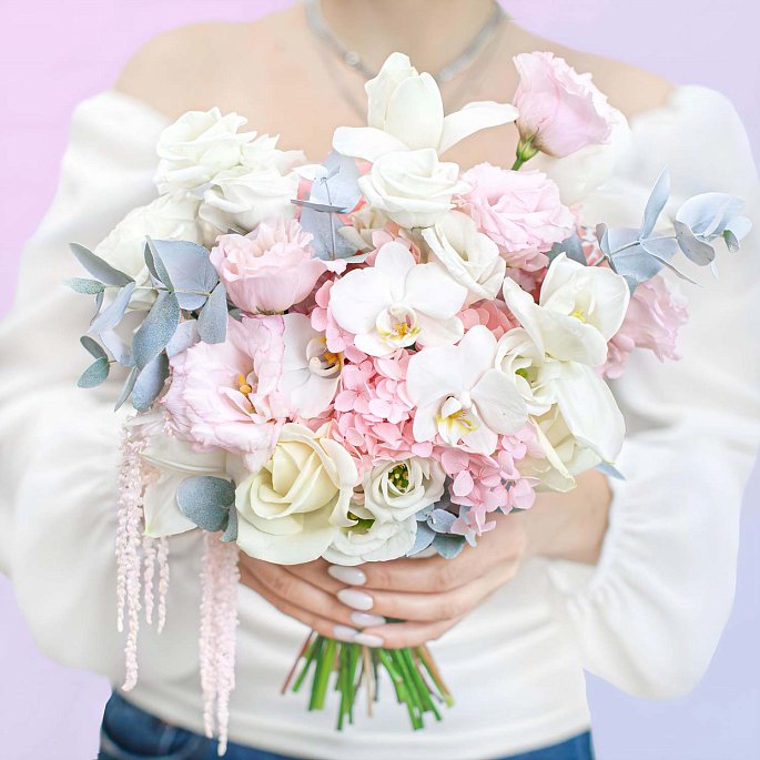 💍 Нежный свадебный букет Крем-де-Флер – воплощение элегантности и утончённости! 💍Этот букет создан для невесты, которая мечтает о лёгком и воздушном образе. Белые орхидеи, розы, пионовидные цветы и нежная гортензия создают гармоничное сочетание пастельных оттенков. Акценты из серебристого эвкалипта и воздушного амаранта придают композиции особую лёгкость и стиль.