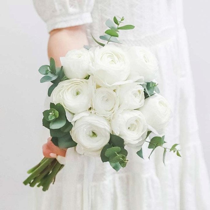 💍 Изысканная нежность в каждом лепестке! 💍Свадебный букет из белых ранункулюсов — воплощение лёгкости и элегантности. Эти цветы напоминают миниатюрные пионы, а их воздушные лепестки создают эффект невесомости. Дополненный свежей зеленью эвкалипта, букет выглядит утончённо и стильно, идеально сочетаясь с классическими и минималистичными свадебными образами.