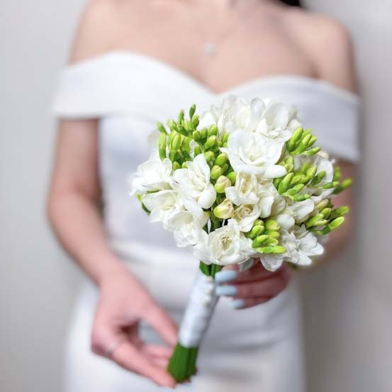 💍 Элегантность в каждой детали! 💍Этот свадебный букет из белоснежных фрезий – воплощение нежности, чистоты и изысканности. Лёгкий аромат цветов создаёт особую атмосферу, а аккуратное оформление делает его идеальным дополнением к образу невесты.