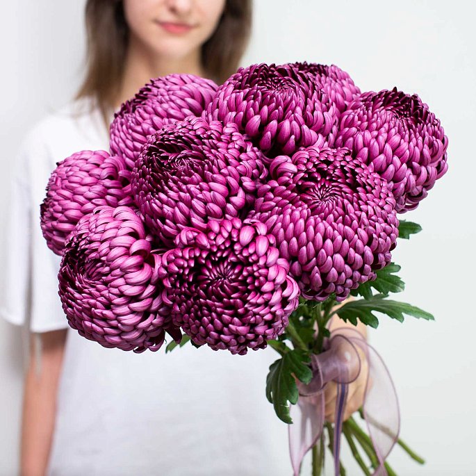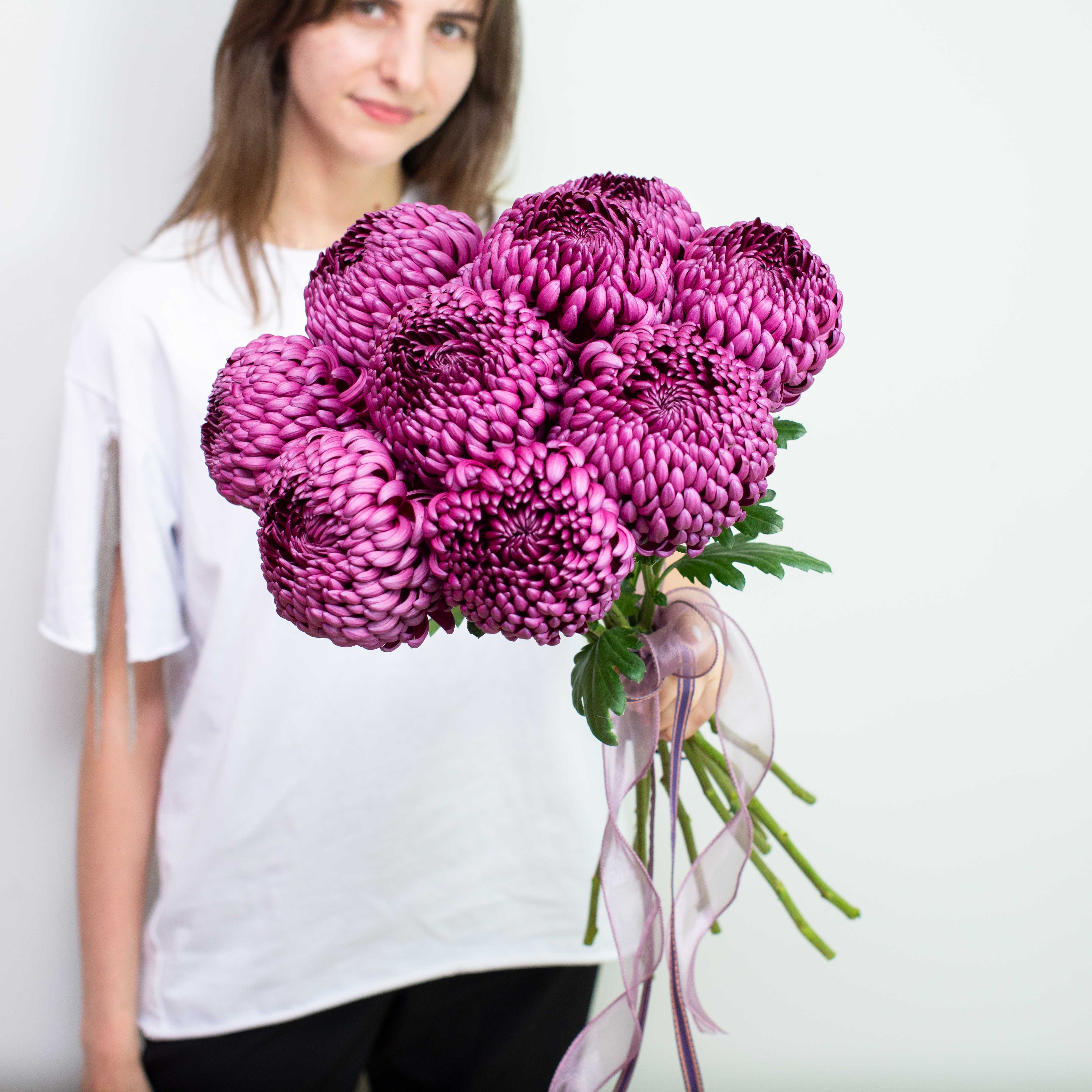 Букеты из 9 крупных осенних хризантем. Букет без упаковки, но по вашему желанию может быть ей дополнен. Атласная лента.Примерный диаметр букета: 20-25 см