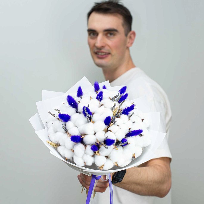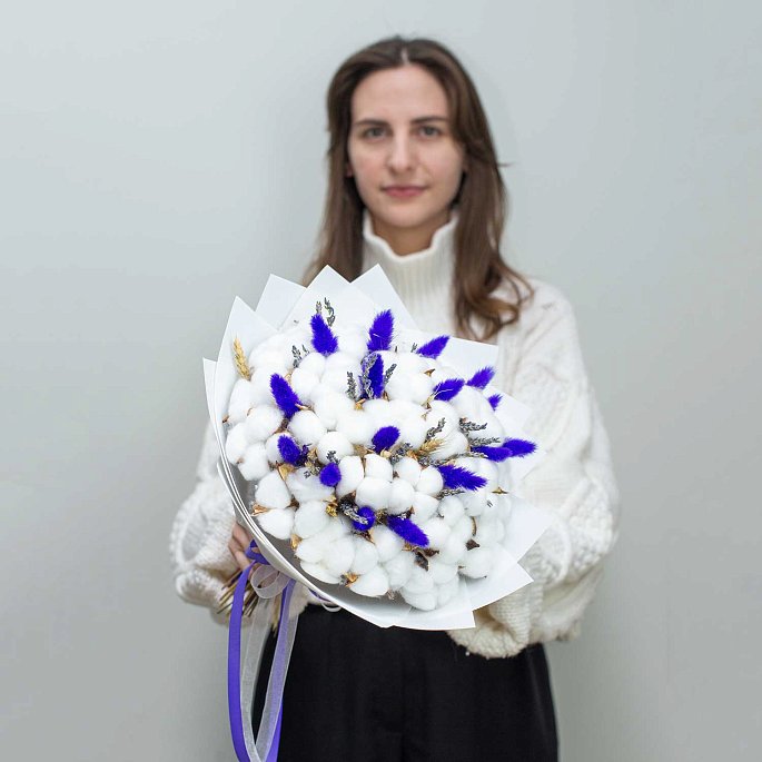 Небольшой букет из сухоцветов - лаванда, 23 цветка хлопка, лагурус. Упаковка - белый лен и атласные ленты.Примерный диаметр букета: 27-30 см
