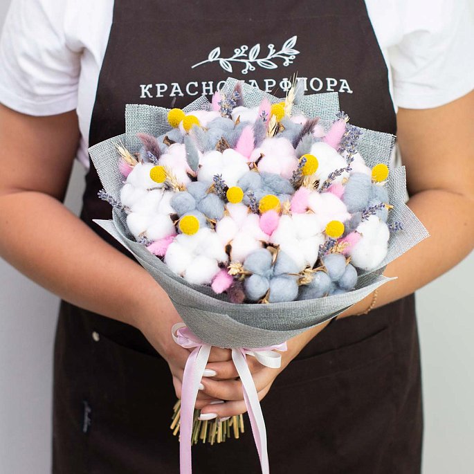 Букет из сухоцветов - лаванда, 23 цветка хлопка, лагурус. Упаковка - лен и атласные ленты.Примерный диаметр букета - 25-29 см