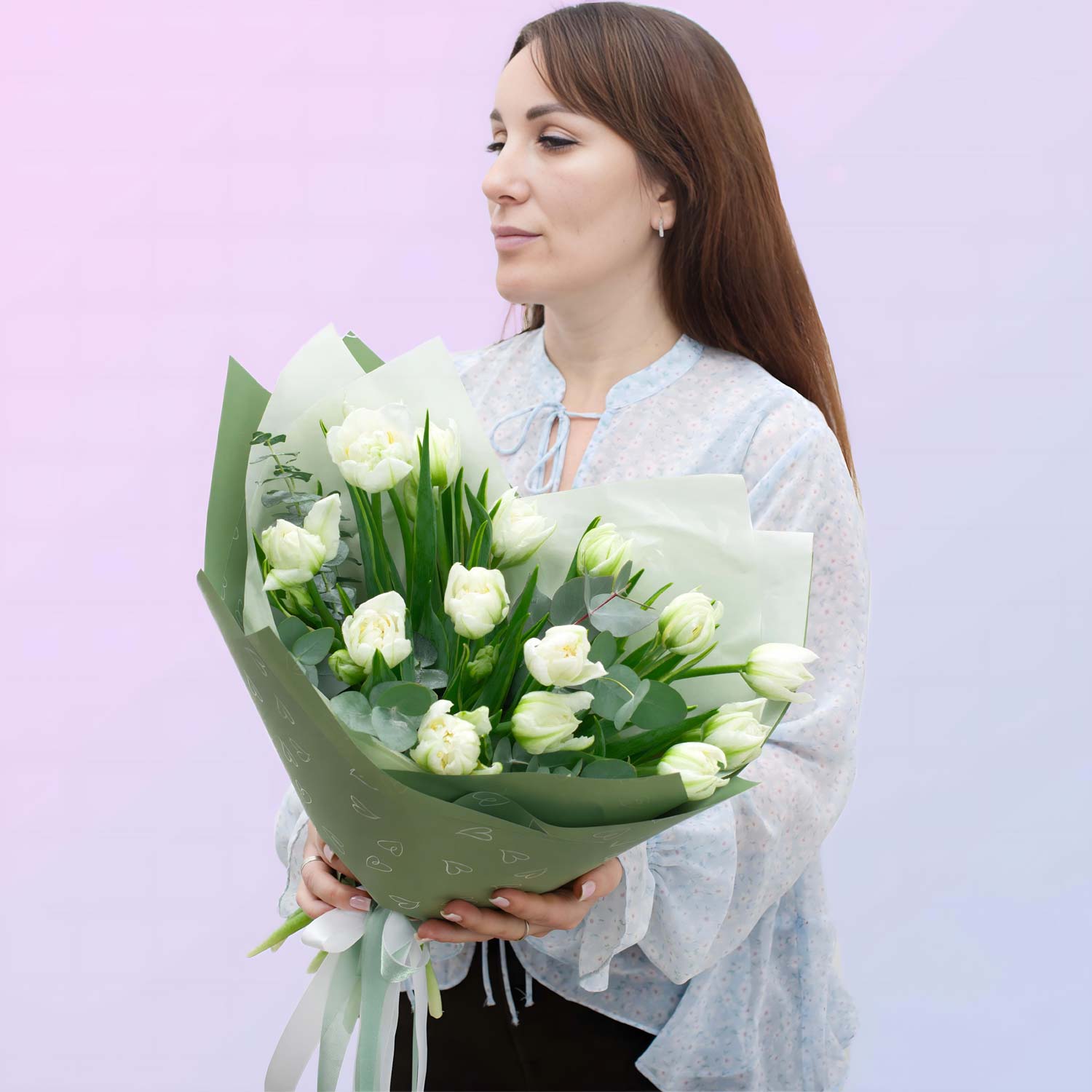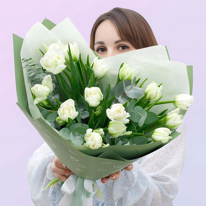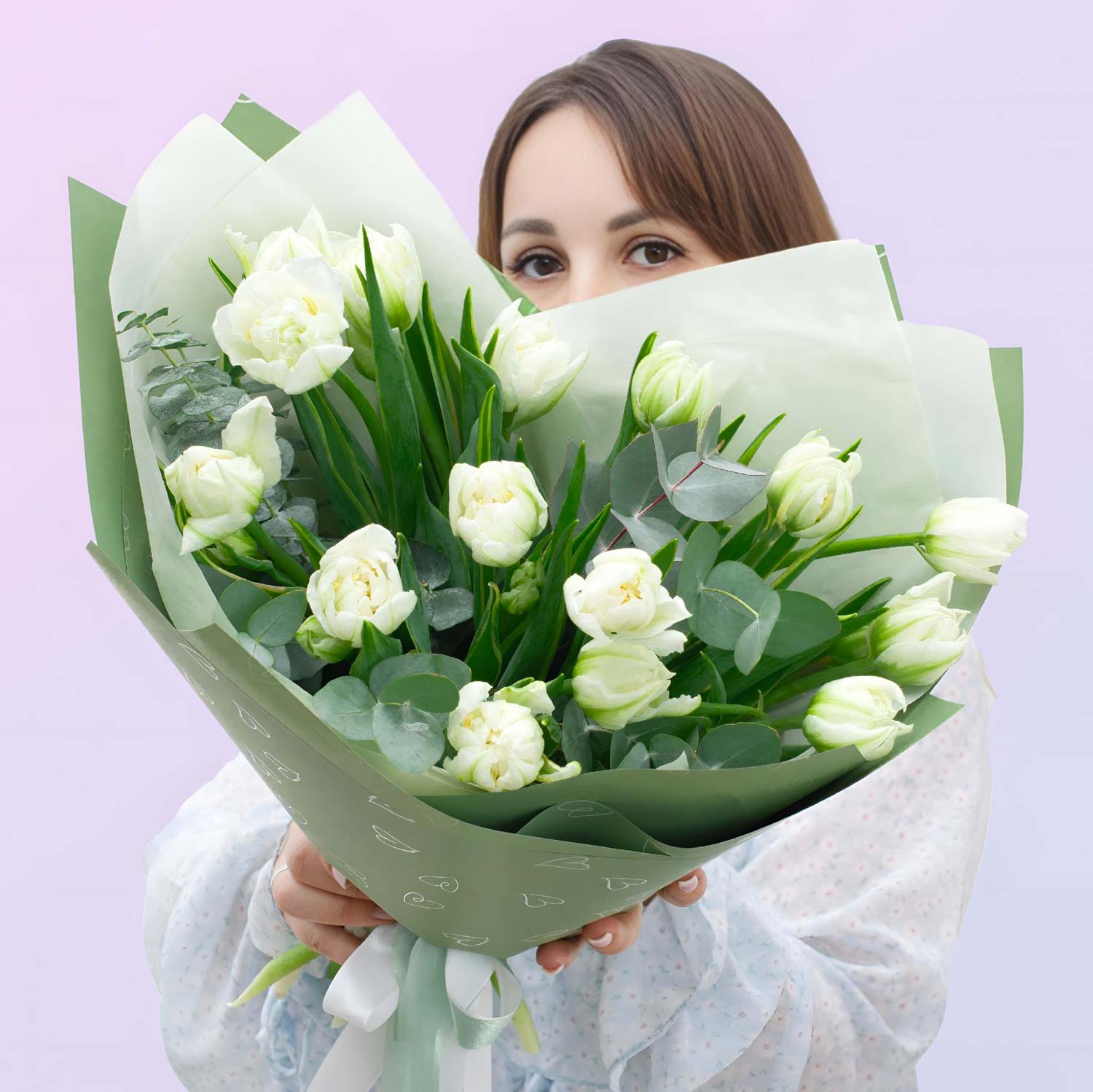 Эталон стиля и элегантности. Моно-букет из белоснежных пионовидных тюльпанов и ароматного эвкалипта в дизайнерской упаковке. Идеальный выбор для тех, кто ценит минимализм и «дорогую» простоту.