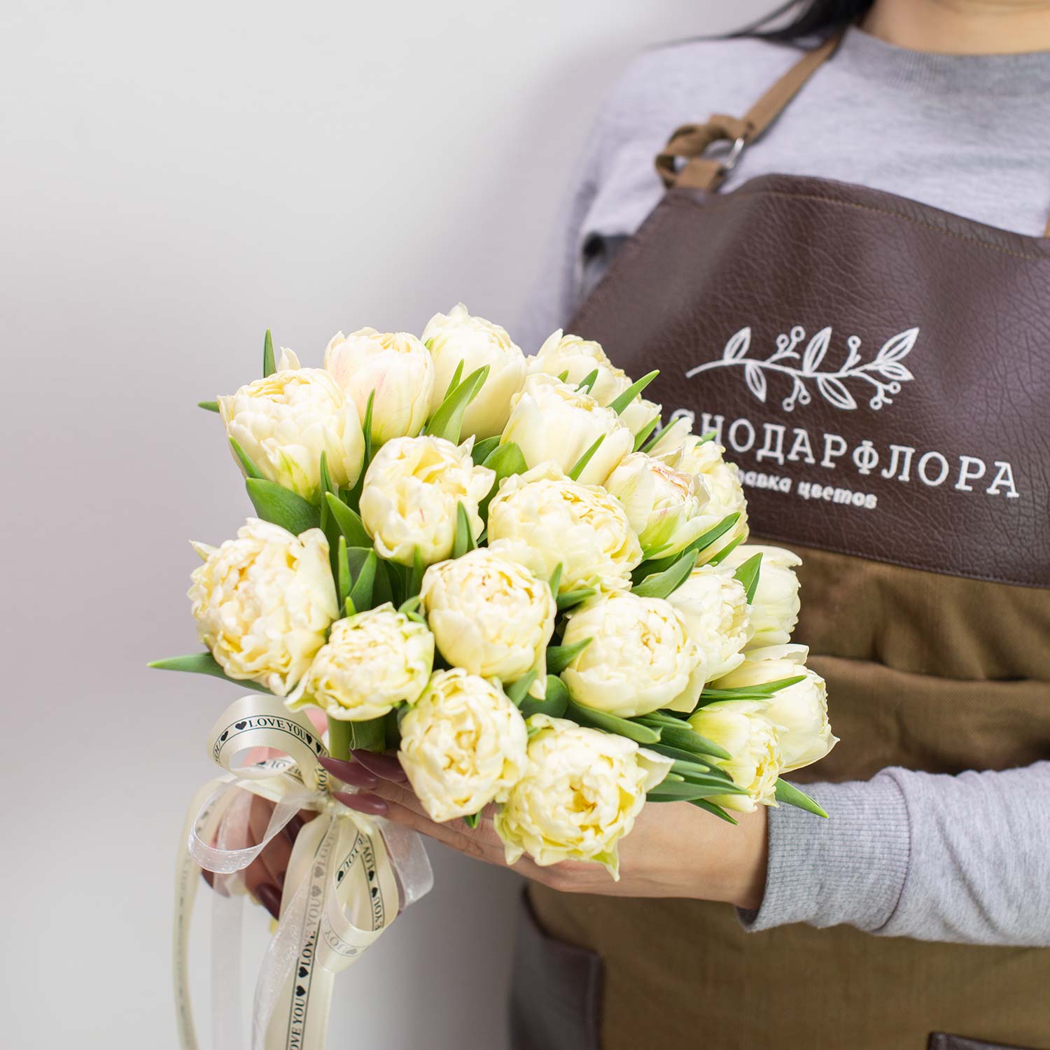 Нежный букет без упаковки из редких крупных кремовых пионовидных тюльпанов.!Ограниченное предложение!