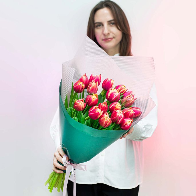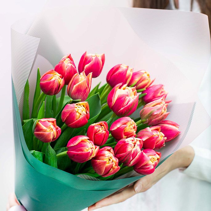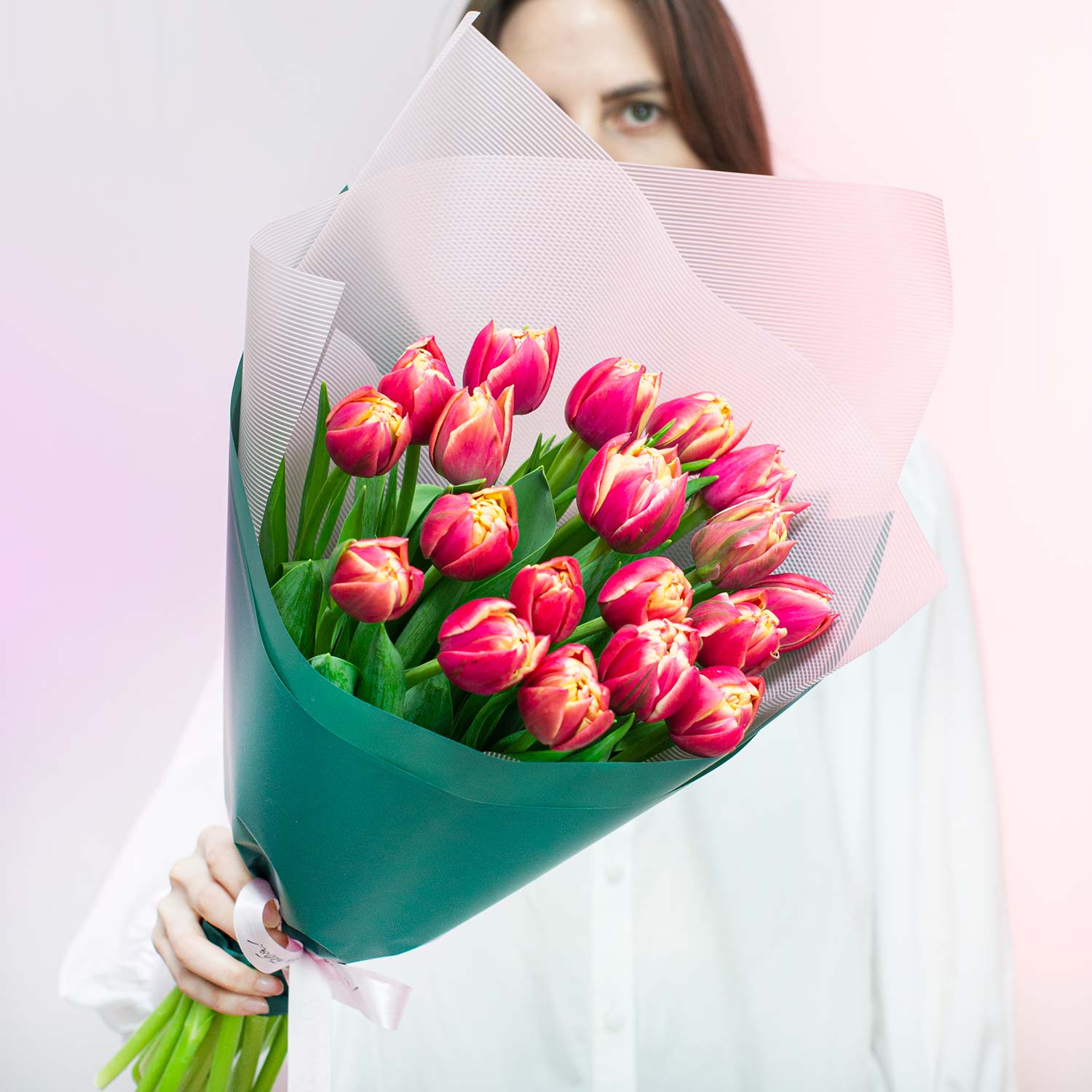 Яркий букет с упаковкой из крупных пионовидных тюльпанов сорта "Коламбус"!Ограниченное предложение!
