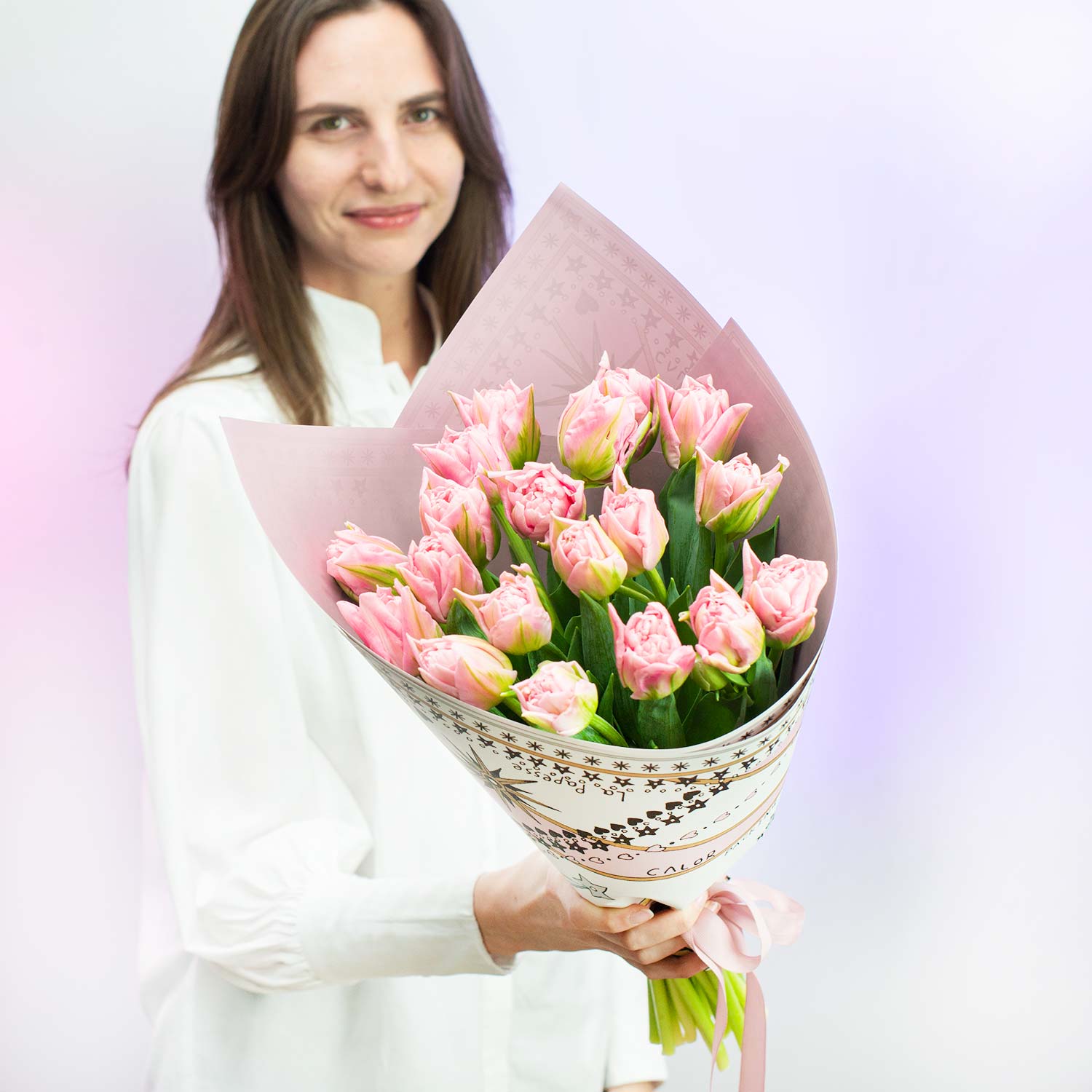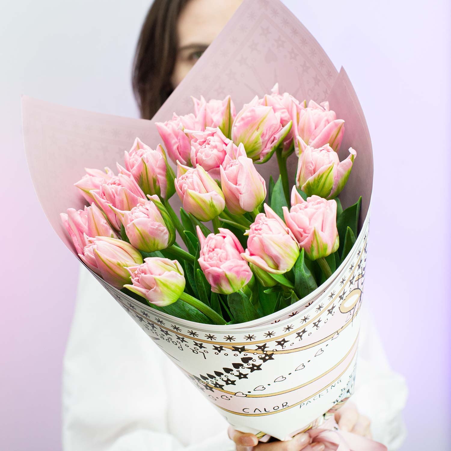 Нежный букет из редких розовых пионовидных тюльпанов в яркой упаковке.!Ограниченное предложение!