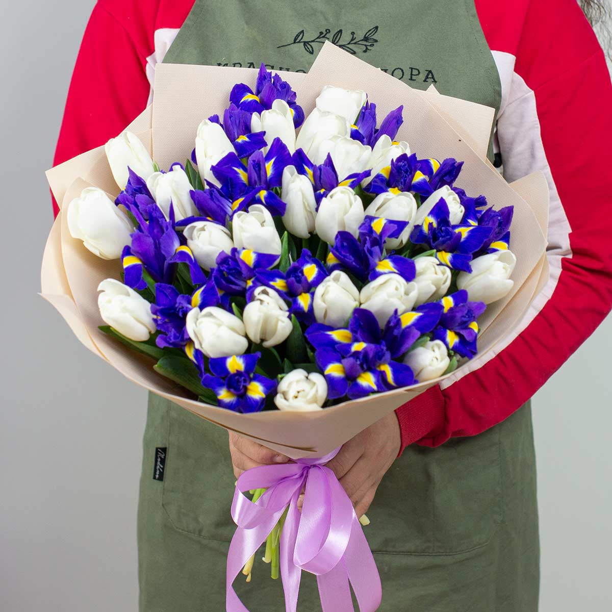 Букет из 39 белых тюльпанов и сиреневых ирисов, упаковка - кремовый фоамиран, букет перевязан атласной лентой.Состав букета: