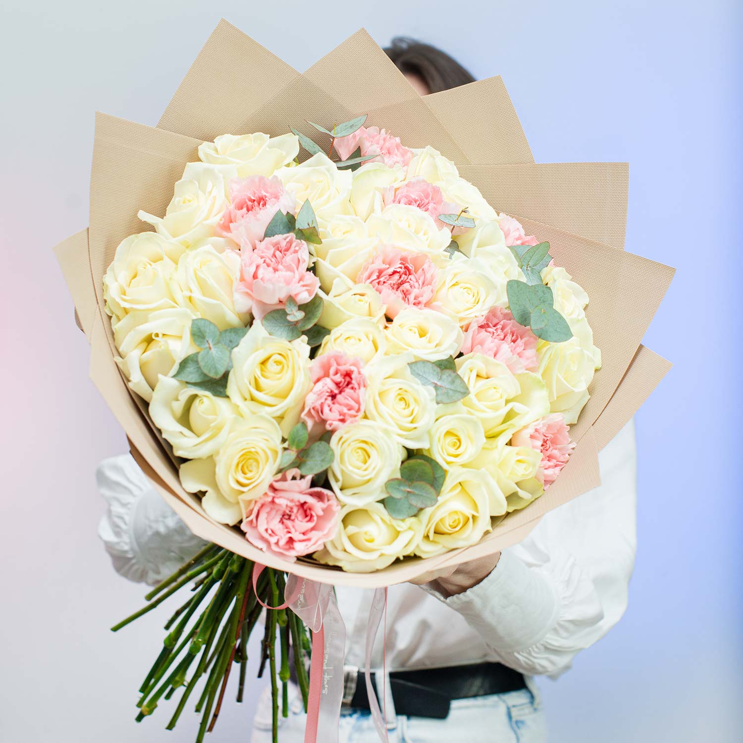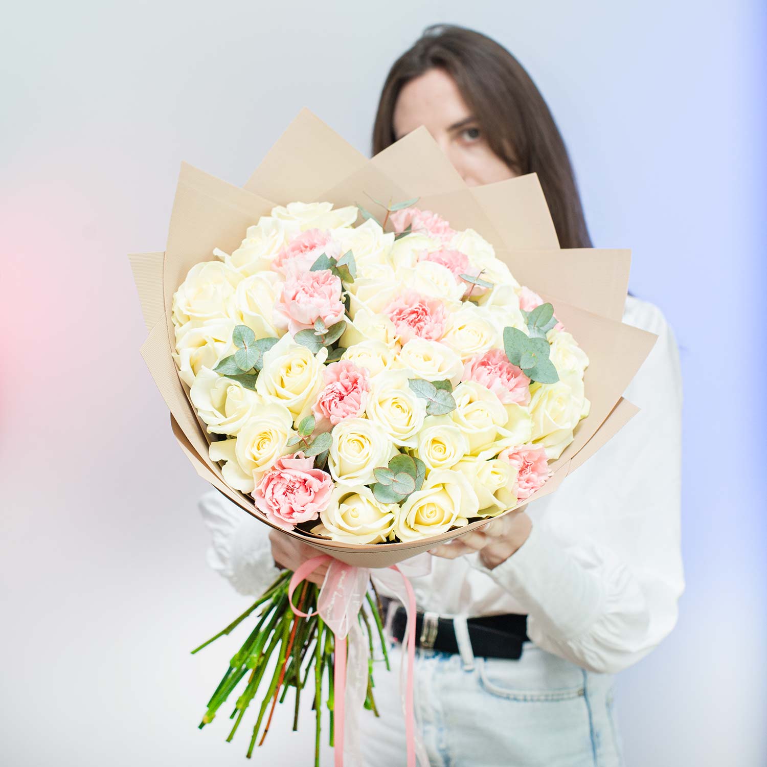 Нежный букет из 28 белых роз сорта "Аваланж" и 9 розовых гвоздик с эвкалиптом сорта "Беби Блю" в упаковке крафт бумага с атласными лентами.Общее количество цветов 37.