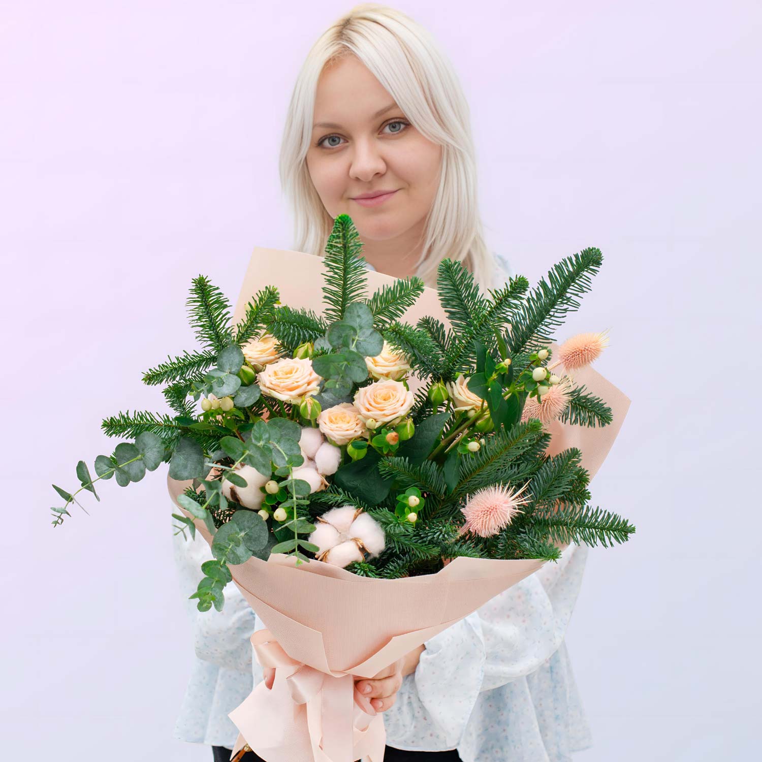❄️ Букет "Нежность зимы" ❄️Стильный и атмосферный зимний микс. Здесь мы соединили ароматную хвою, воздушный хлопок и нежные кустовые розы. Букет выглядит объемным, дорогим и очень уютным — идеальный вариант, если не хочется дарить банальные розы в целлофане.
