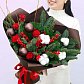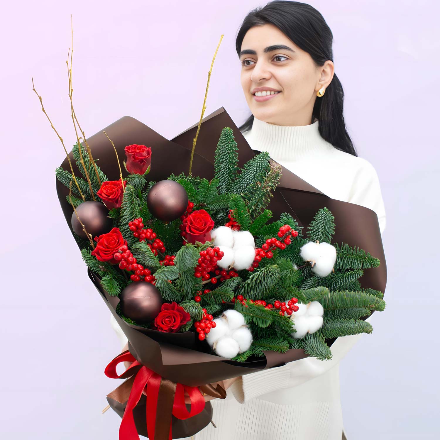 Чарующий зимний букет, собранный из пышных веток ели, алых ягод илекса и нежных шариков хлопка, укутанных в элегантную упаковку.