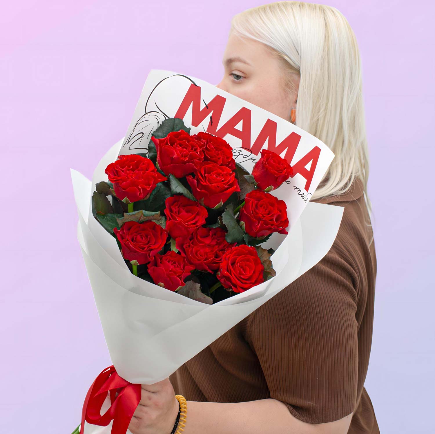 Красные розы «Эль Торро» с насыщенным бархатным оттенком собраны в стильный лаконичный букет с дизайнерской бумагой «MAMA». Современный вариант, который выглядит свежо и со вкусом.
