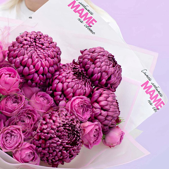 - Максимальный объём за счет крупных хризантем и фактурной зелени;