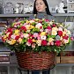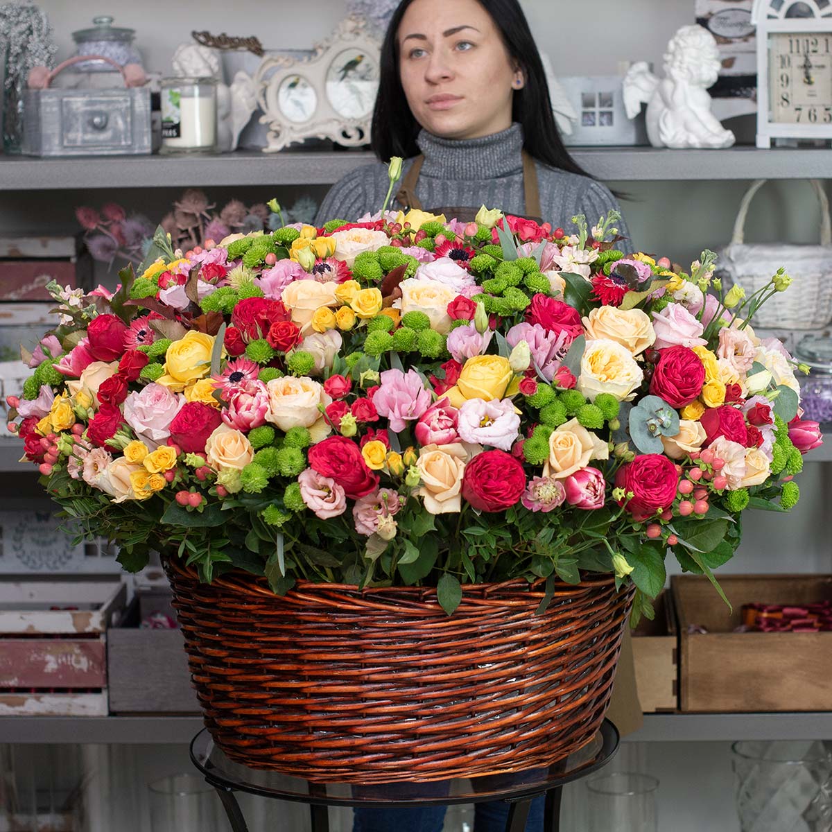 Очень большая и контрастная корзина с ароматными пионовидными розами, яркими хризантемами и большим количеством различных цветов.Состав корзины: