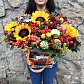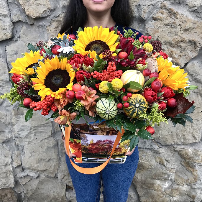 Большая осенняя композиция в плайм-пакете.Состав: 5 подсолнухов, 7 тюльпанов, 5 альстромерий 3 декоративные мини-тыквы, ветка раских яблок, 5 гиперикумов, 10 солидаго, 5 краспедий, 5 скимий, 4 цинерарий, зелень.