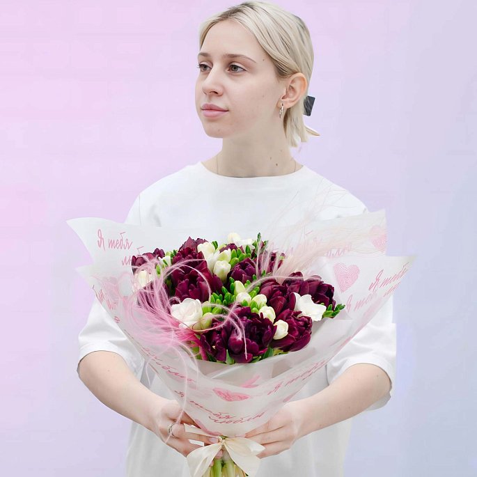 Эффектная игра контрастов и фактур. В этом букете мы соединили 15 пионовидных тюльпанов глубокого винного оттенка с 10 ветками белоснежной душистой фрезии. Легкость и динамику композиции придают 2 ветви декоративного ковыля.