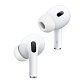 Внутриканальные наушники Apple AirPods Pro второго поколения представлены в белом цвете. Они оборудованы модулем Bluetooth версии 5.3, чипом Apple H2 и сдвоенными направленными микрофонами с системой активного шумоподавления. Эта модель быстро подключается к голосовому ассистенту Siri. На корпусе наушников есть кнопки для управления функциями.