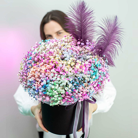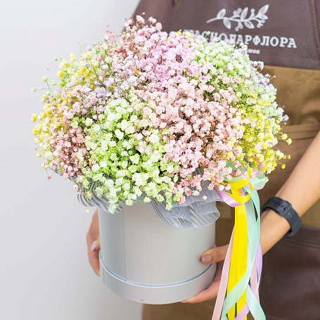 Гипсофила ― цветок с пушистыми бутонами, напоминающими невесомое облако. Растение роскошно смотрится в нежных и воздушных монобукетах, а также отлично сочетается с другими цветами. Гипсофилу можно использовать вместе с орхидеями, кустовыми и пионовидными розами. Допускаются белые, пастельные, радужные, розовые и яркие контрастные оттенки.