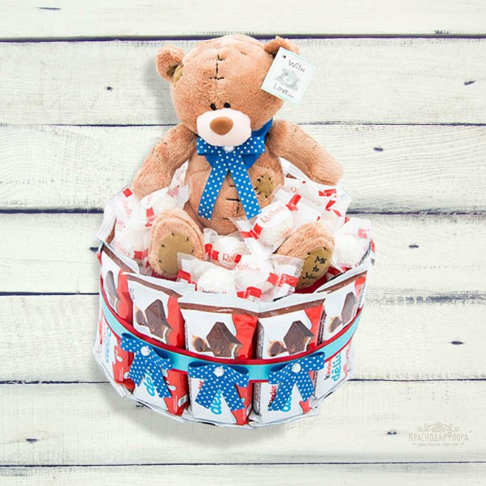 Торт из 13 Киндер Делис, 150 грамм конфет Раффаэлло с мишкой и декоративными элементами.Размер композиции 26*26 см