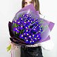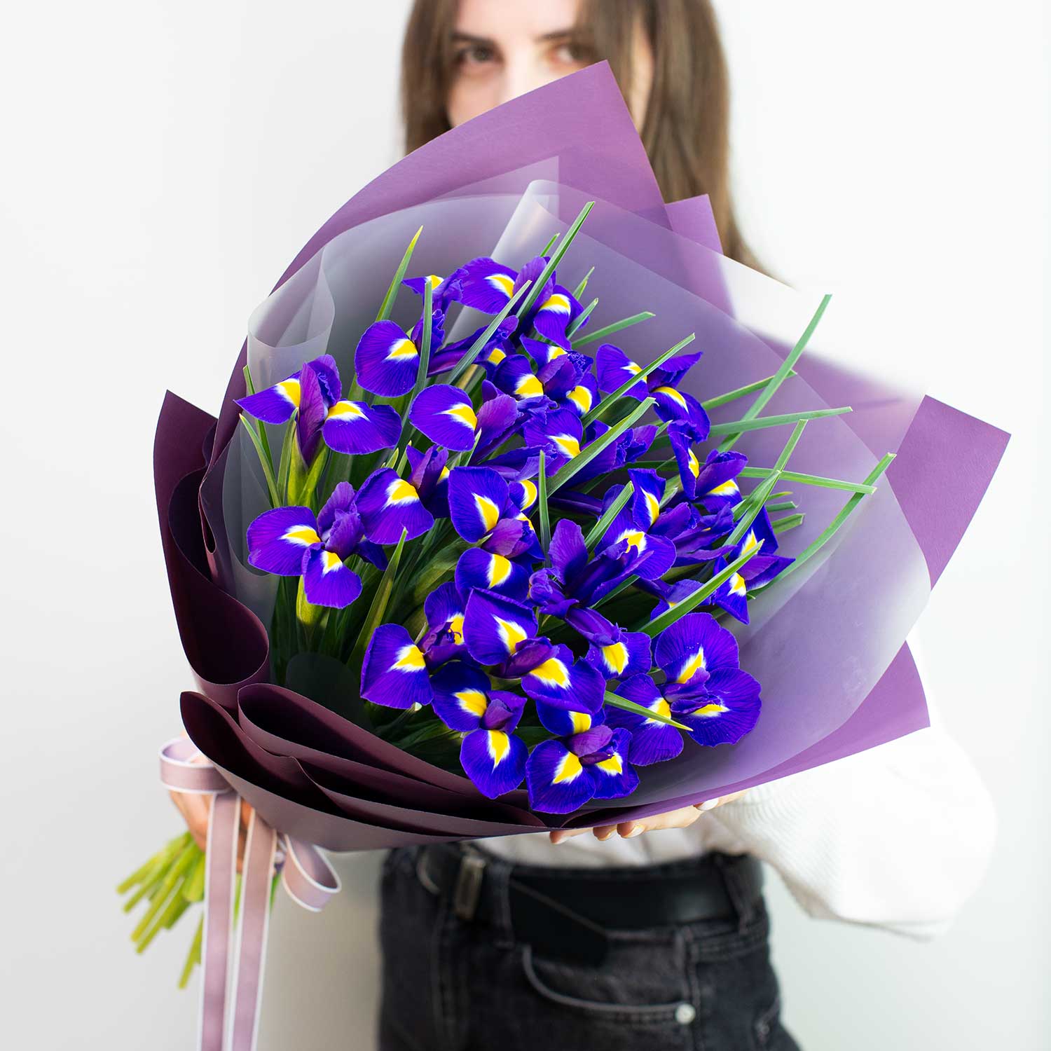 Букет из фиолетовых импортных голландских ирисов. Упаковка сиреневого цвета с белой прозрачной подложкой.Примерный диаметр букета: 30 см