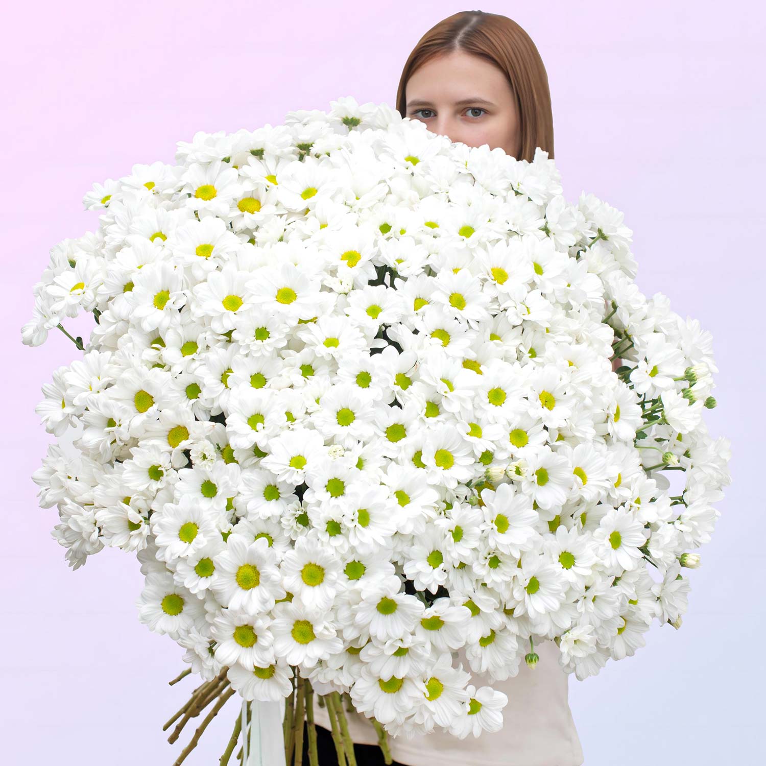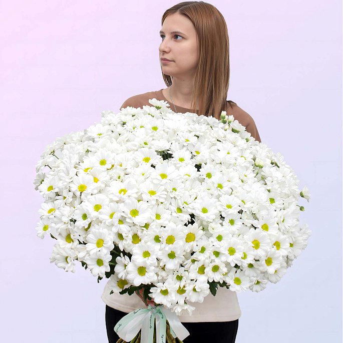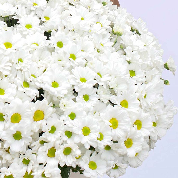 Объемный и выразительный букет из свежих белых хризантем. Этот букет выглядит особенно воздушно и подходит для подарка в осенний сезон, когда так важно напомнить о свете и радости.