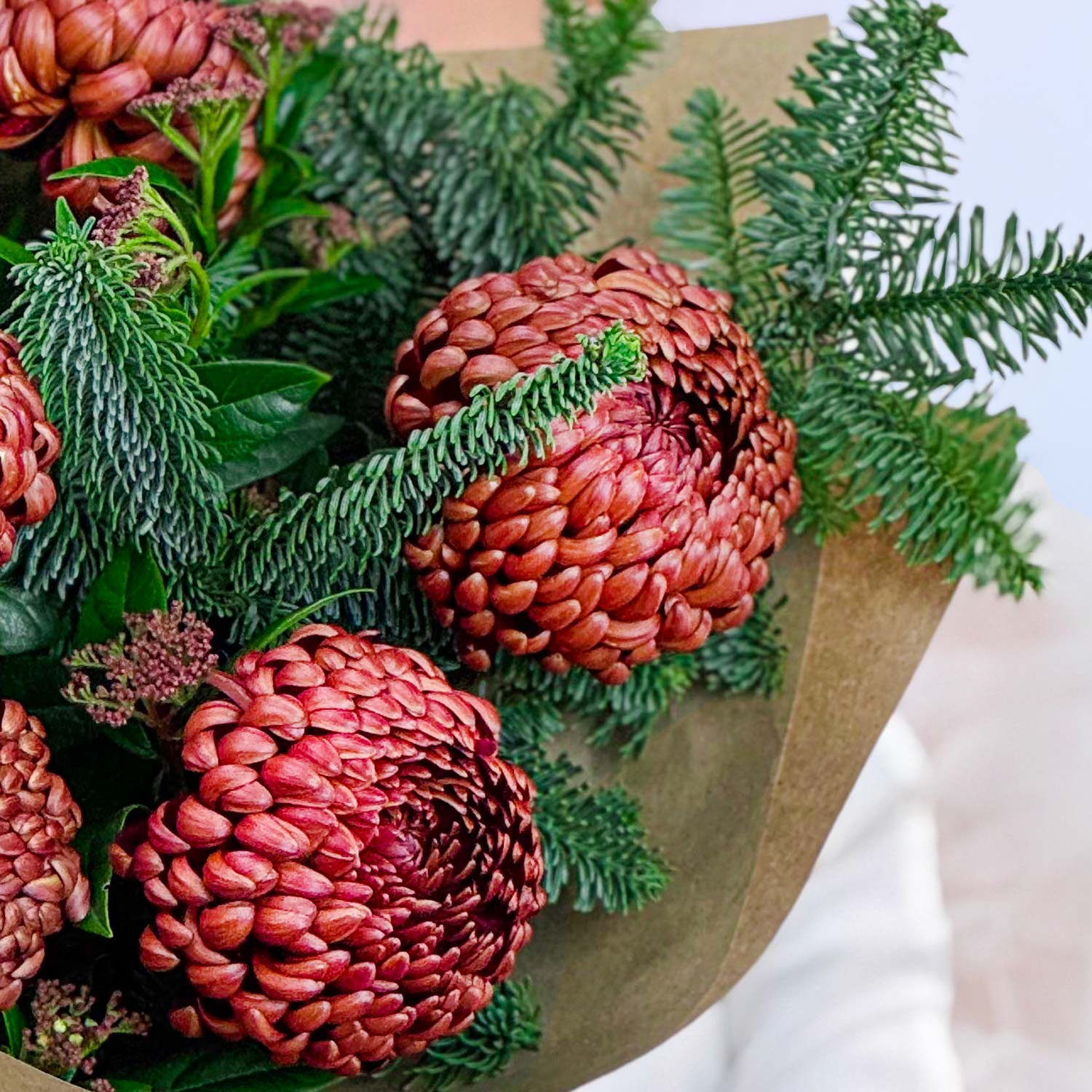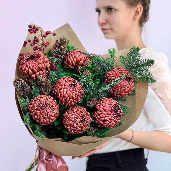 🎄 Этот букет станет настоящим украшением зимнего сезона! 🎄"Зимний уют" — это букет, который переносит вас в атмосферу снежных праздников и тёплого уюта. Классические хризантемы в насыщенных оттенках прекрасно сочетаются с благородной зеленью нобилиса и акцентами в виде ярких ягод и шишек. Композиция идеально подойдёт для тех, кто хочет создать зимнее настроение.