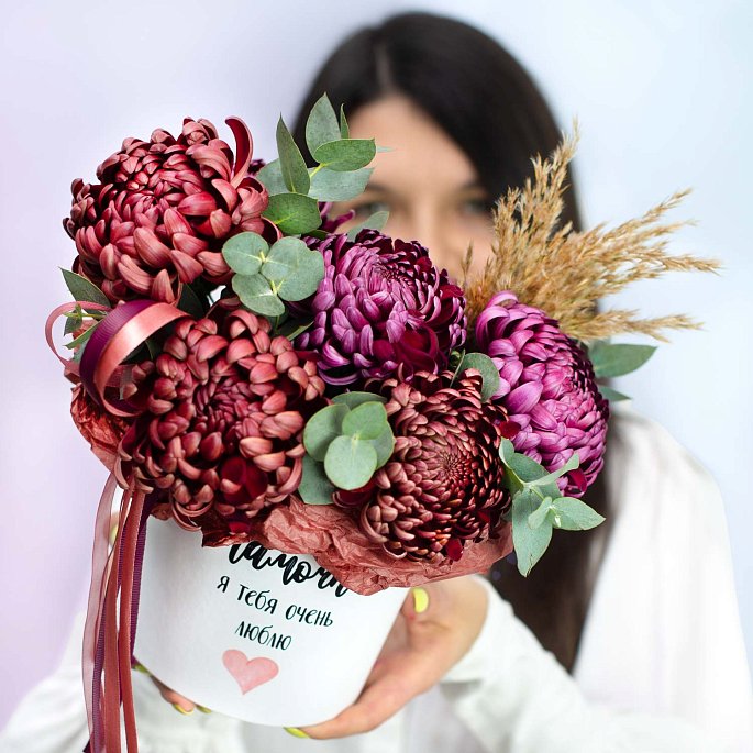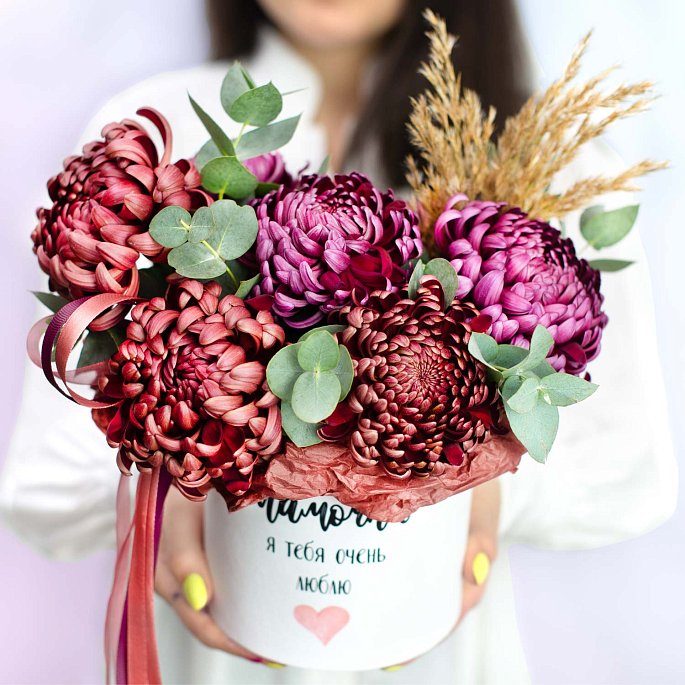 💖 Великолепное предложение ко дню мам! 💖Коробка из 7 хризантем, с эвкалиптом и сухоцветами "Мама, я тебя очень люблю!" Сорт этих хризантем - настоящий хит осени.