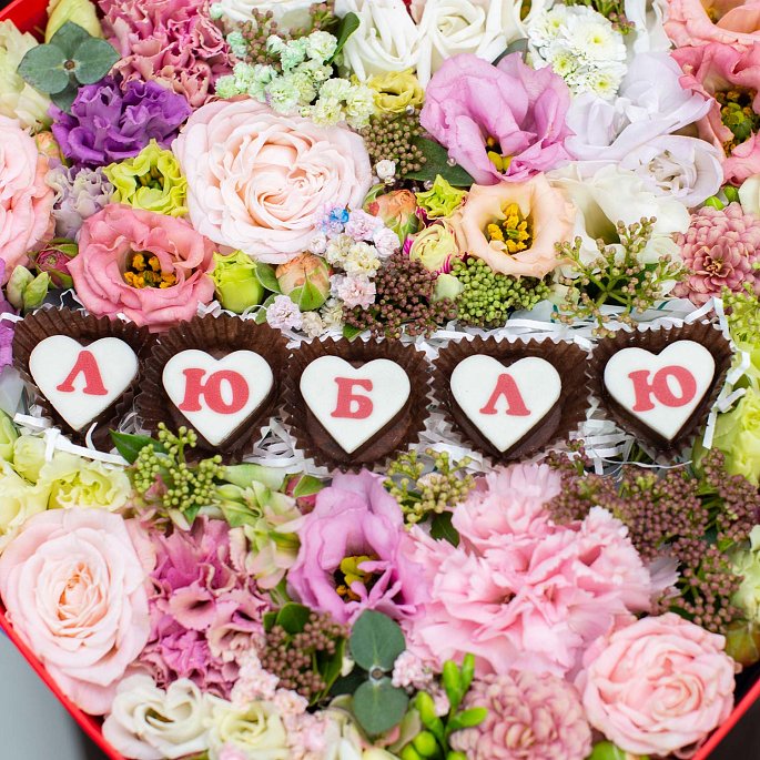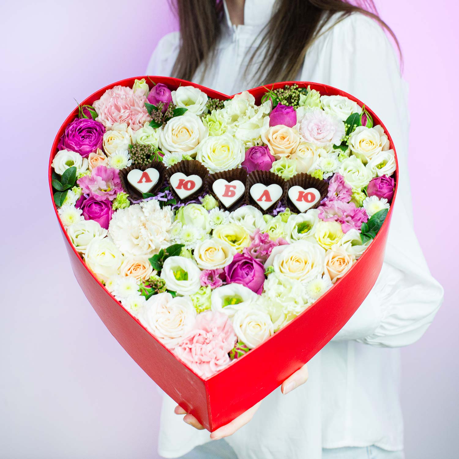 Коробочка в форме сердца с крышкой, внутри композиция из микс цветов с шоколадом из букв "ЛЮБЛЮ"Состав композиции: