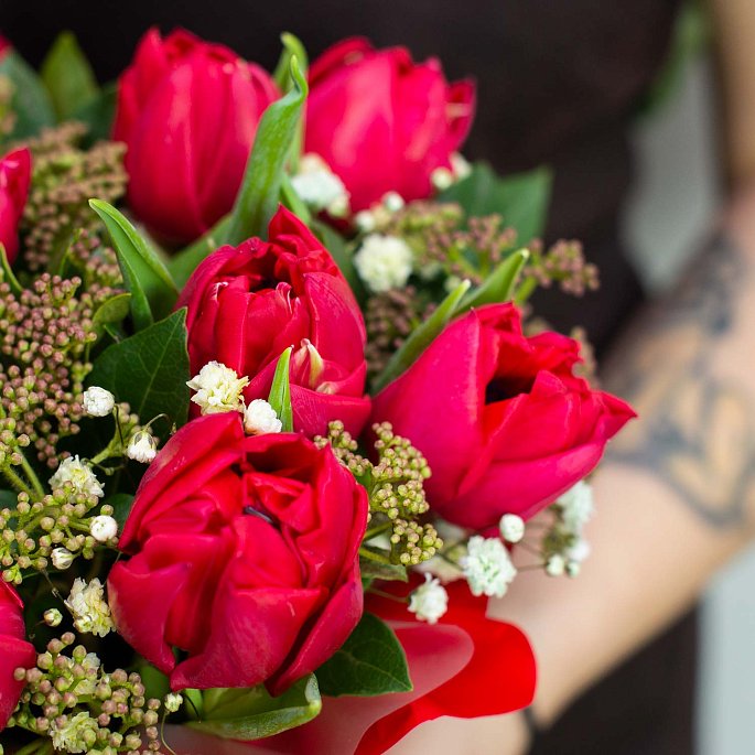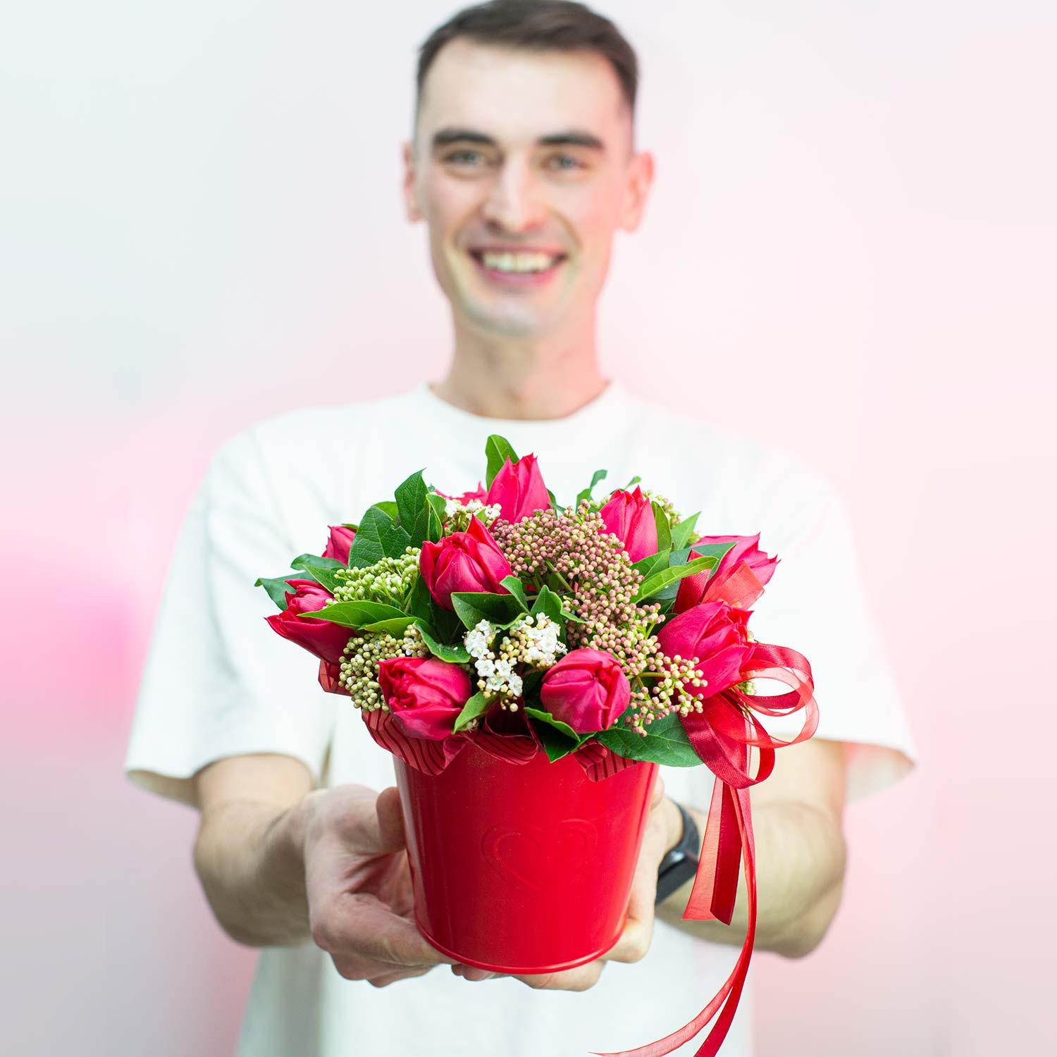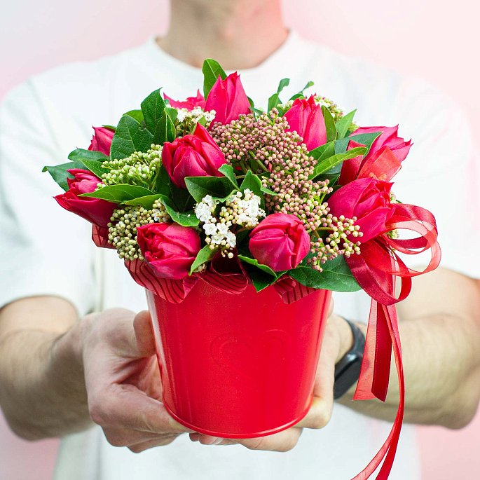 Композиция в красных тонах в ведерке с сердечком из 11 пионовидных тюльпанов.Состав композиции: