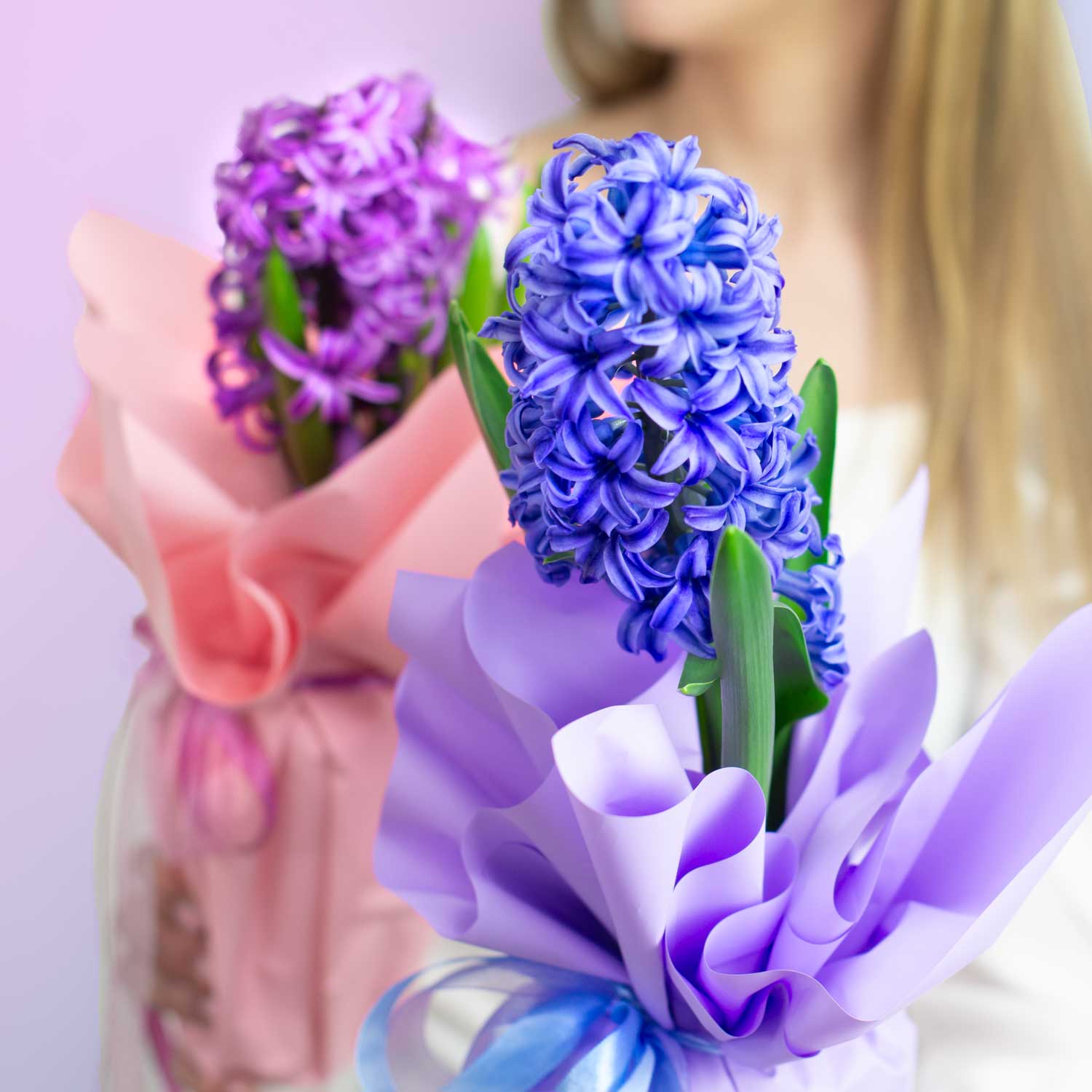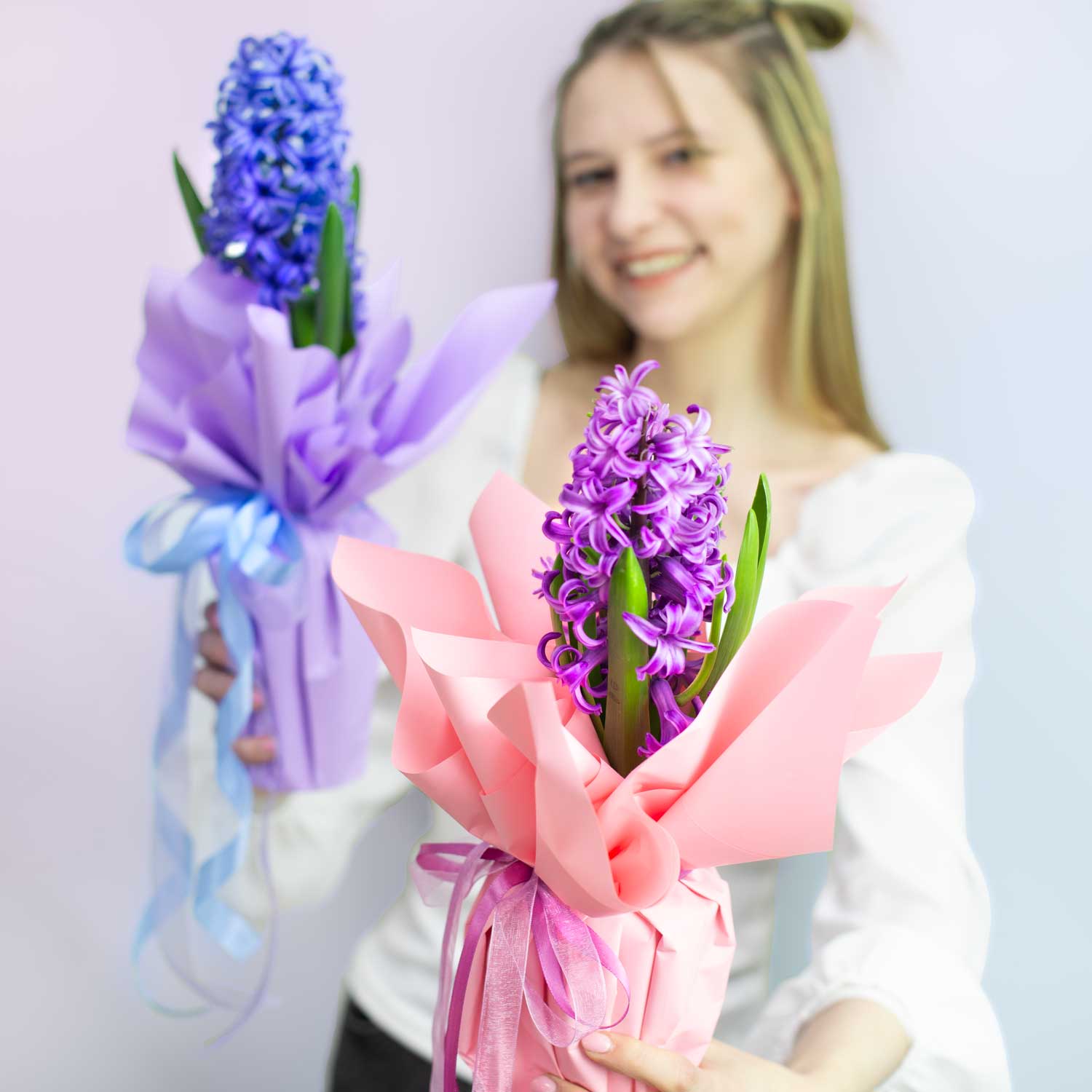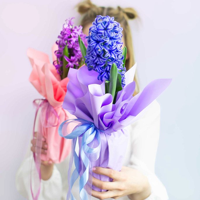 Возможные варианты цветов синего гиацинта доступны для уточнения у наших менеджеров. Выбирайте идеальный оттенок для своего подарка!