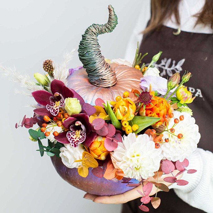 Хотите удивить крутой и необычной осенней композицией в тыкве? Наши флористы делают магические тыквы с ароматными осенними цветами, которые создают волшебное настроение.Мы указываем примерный состав, потому что каждая композиция полностью индивидуальна.
