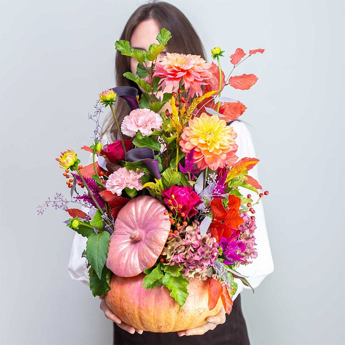 Хотите удивить крутой и необычной осенней композицией в тыкве? Наши флористы делают магические тыквы с ароматными осенними цветами, которые создают волшебное настроение.Мы указываем примерный состав, потому что каждая композиция полностью индивидуальна.