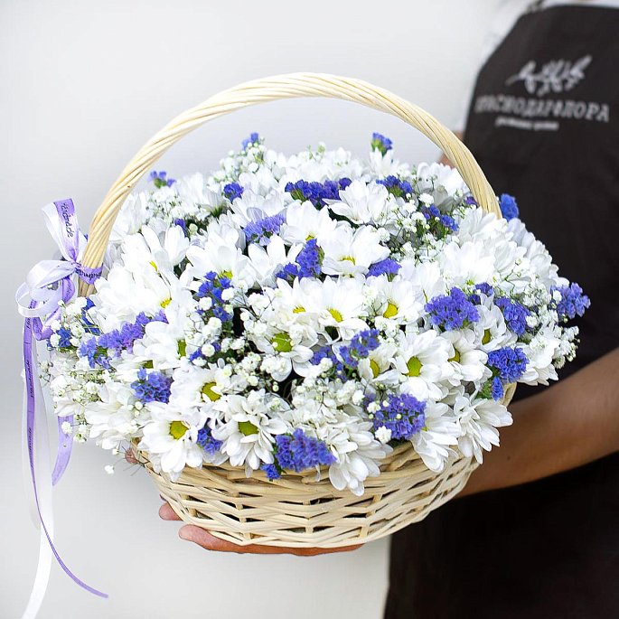 Корзина из ромашковых хризантем и статицы