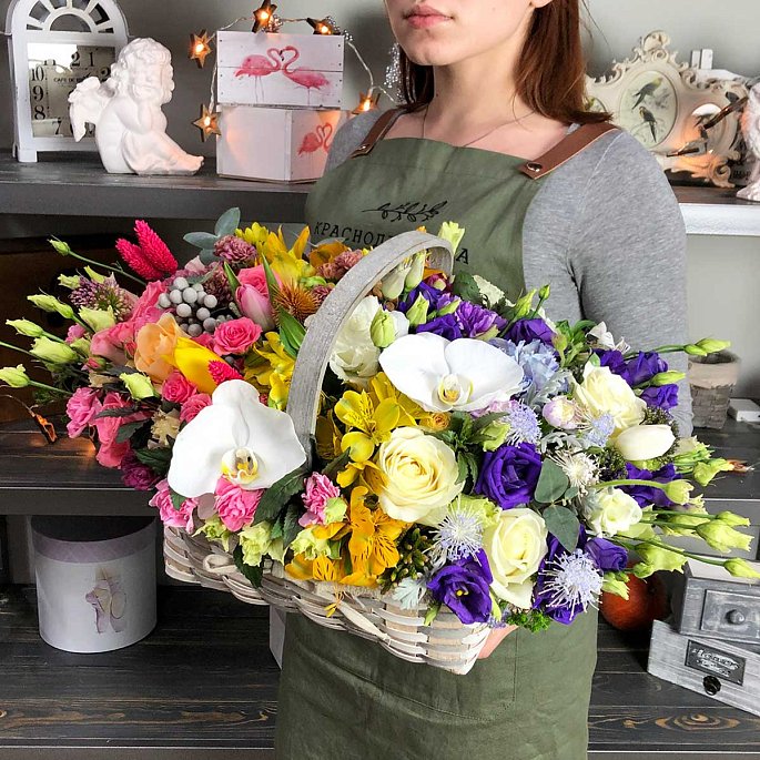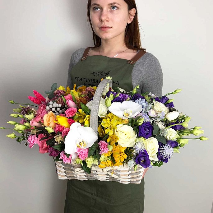 Яркая цветочная композиция в плетеной корзине.Роза «Аваланж» - 4 шт.