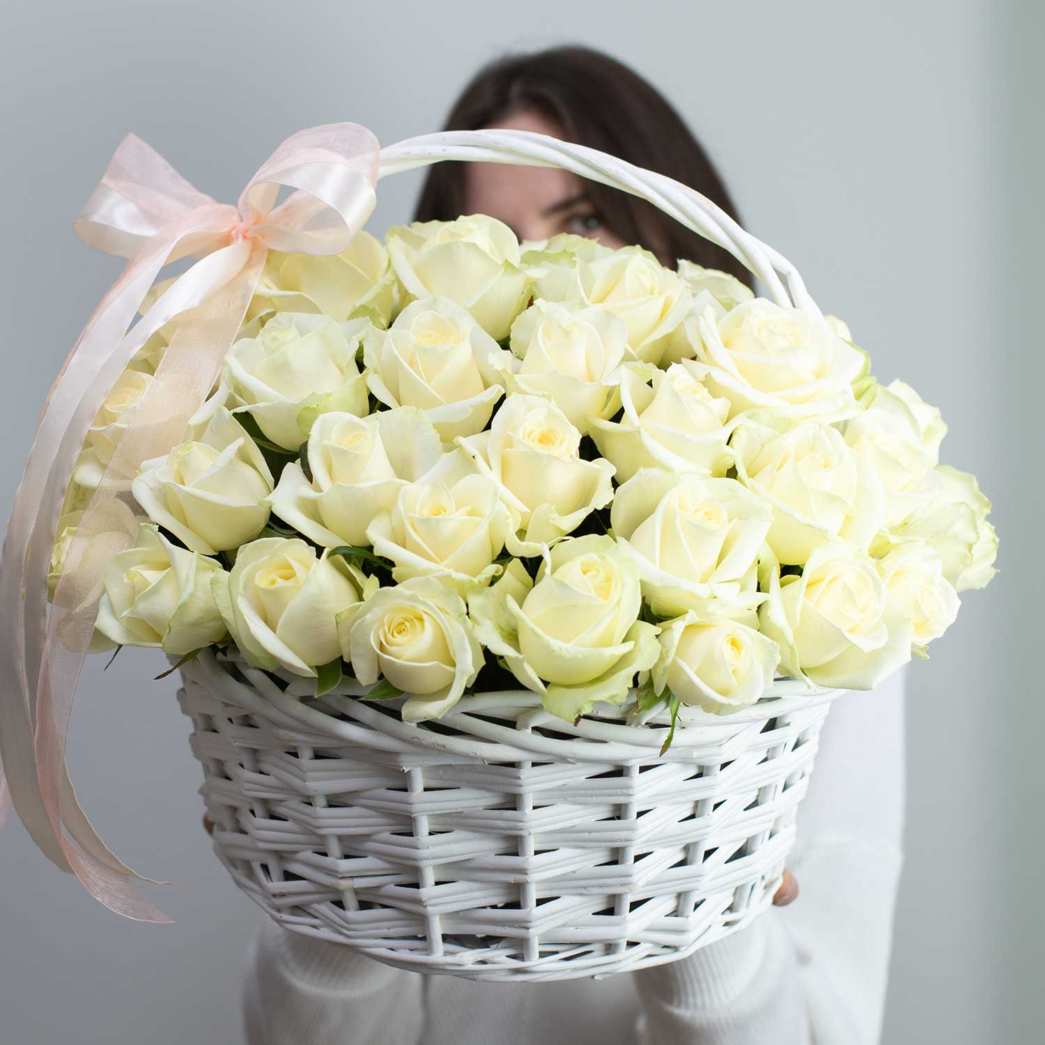 Современная качественная корзина в белых тонах из 59 белых Российских роз сорта "Аваланж".Примерный диаметр цилиндра с розами: 40-45 см