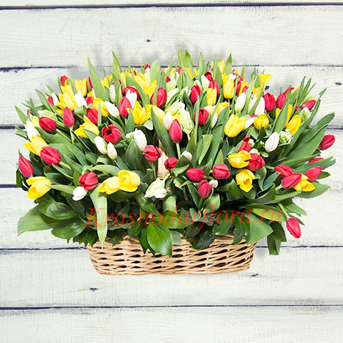 Шикарная корзина из 231 тюльпана и зелени. Размер корзины 110*60 см. Высота 60 см.Время создания и доставки: 2 ч.
