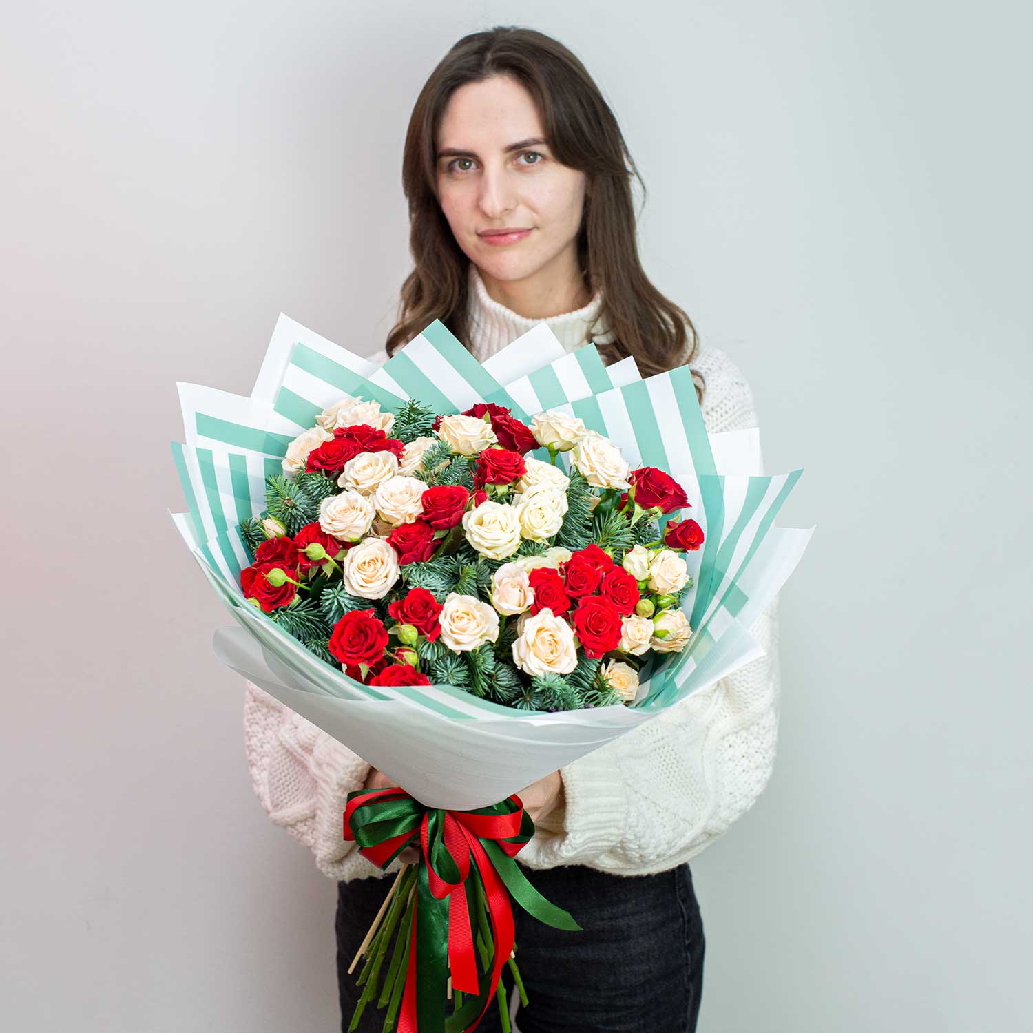 Букет из 15 красных и кремовых кустовых роз