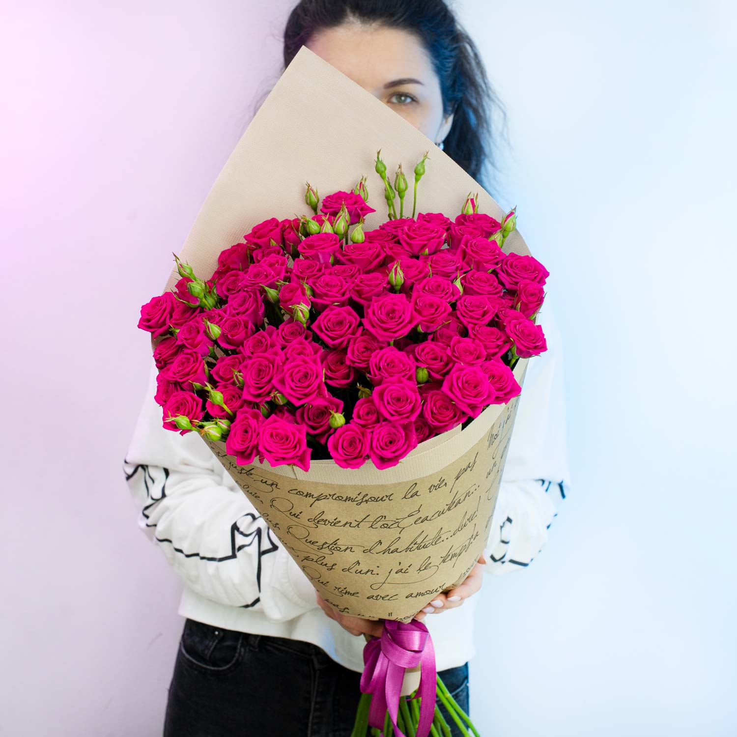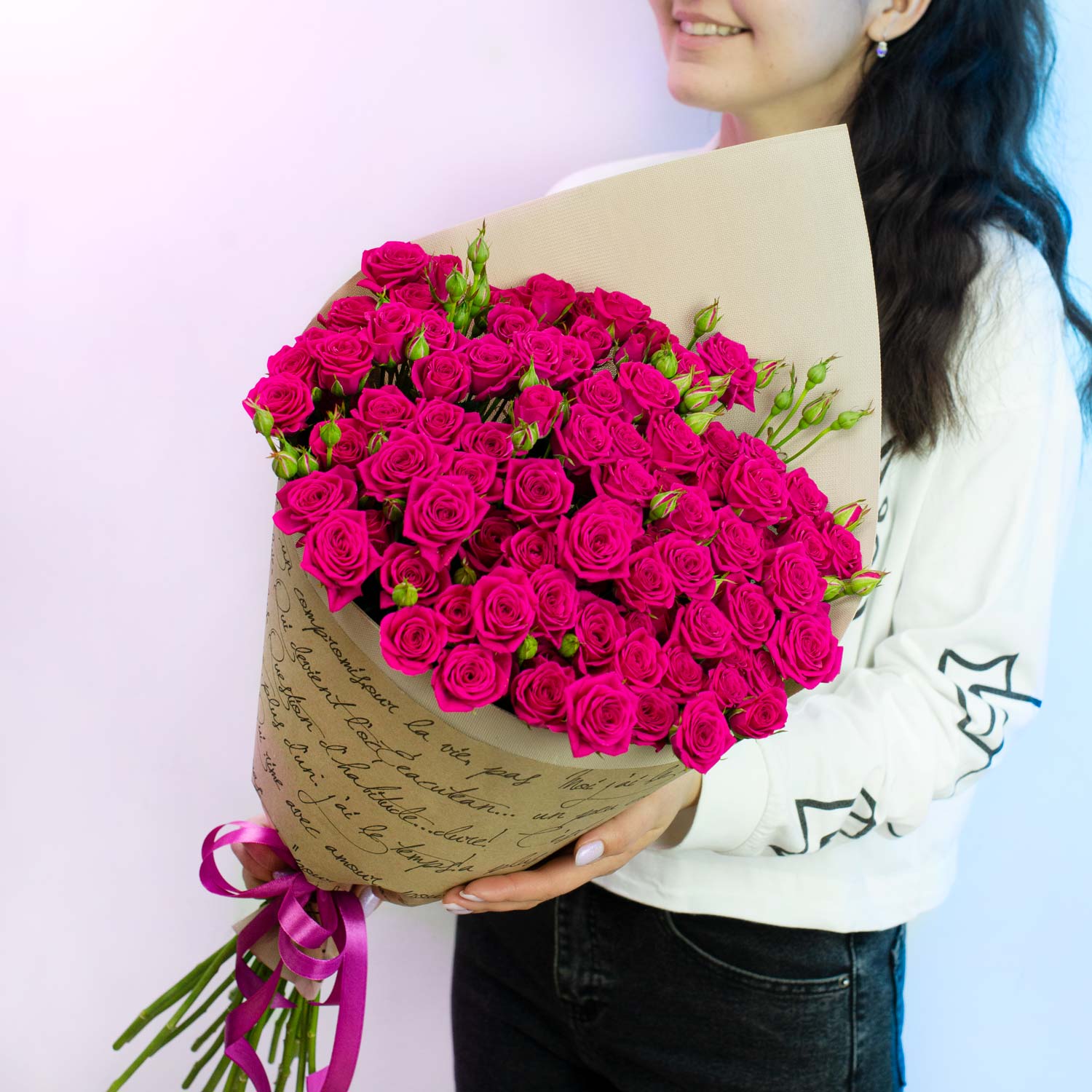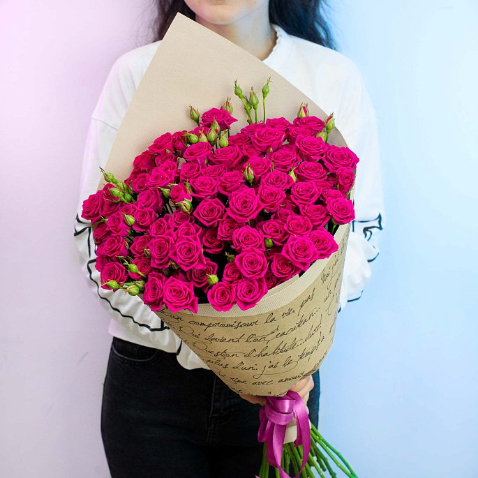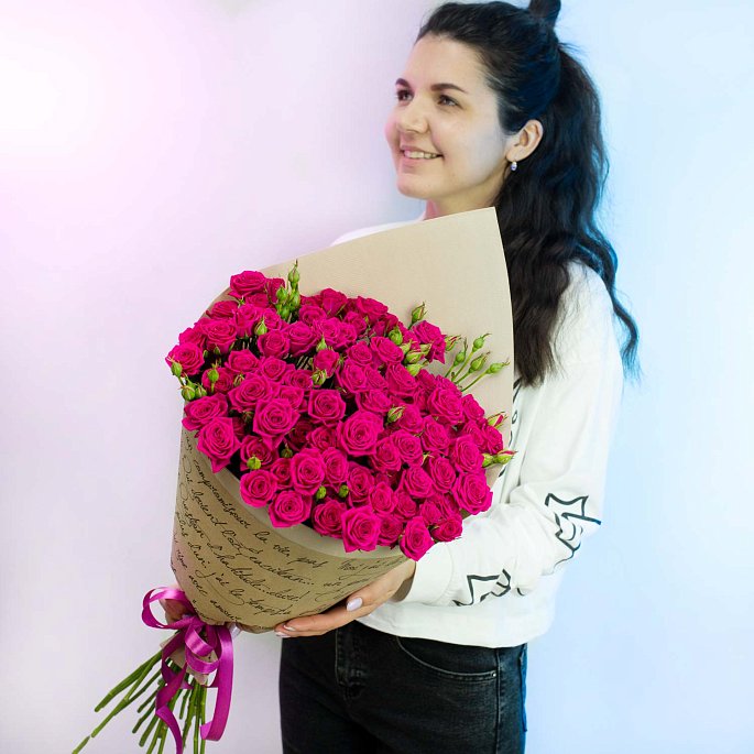 Букет из 19 малиновых кустовых роз представляет собой замечательный подарок для особых случаев или просто чтобы порадовать близкого человека. Кустовые розы отличаются большим количеством цветков на одном стебле, что придает букету пышность и объем.Оформление букета в крафт-бумаге добавляет естественности и простоты, подчеркивая красоту цветов и делая акцент на их насыщенном малиновом оттенке.