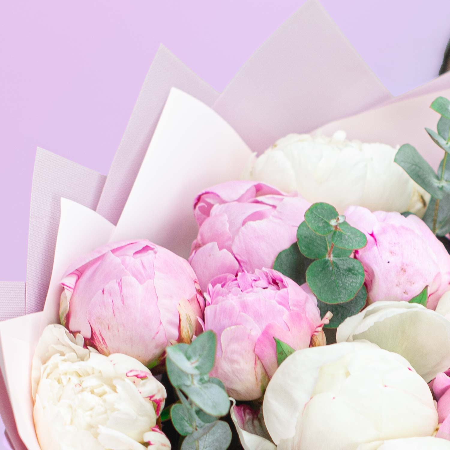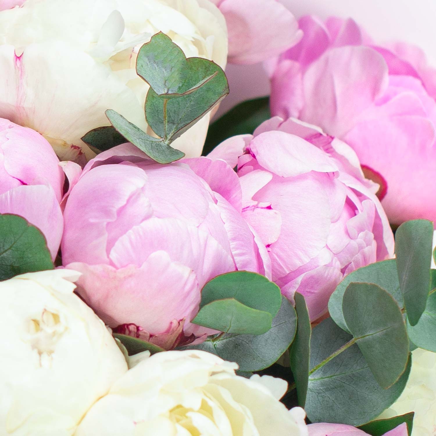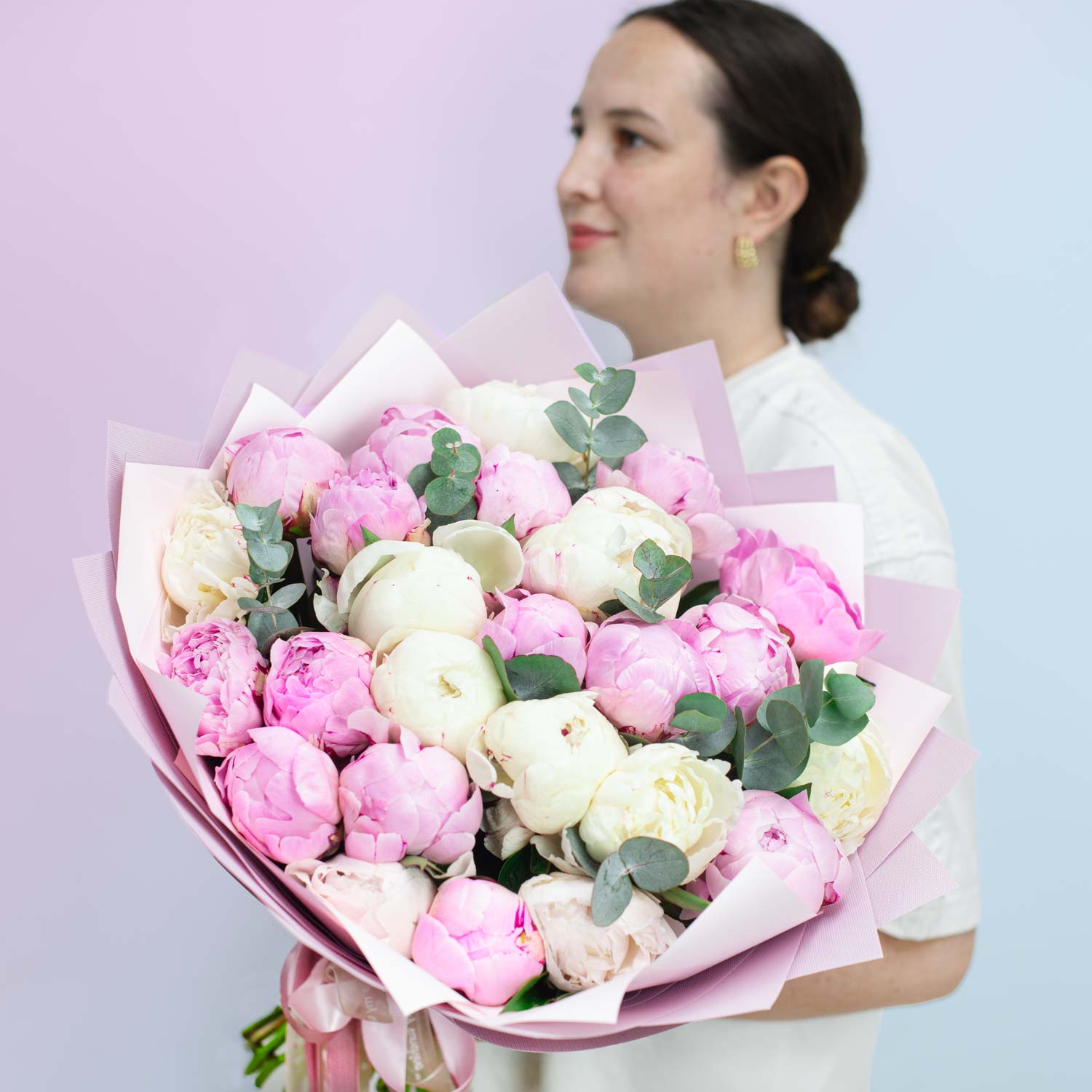 Букет из 25 белых и розовых пионов с эвкалиптом