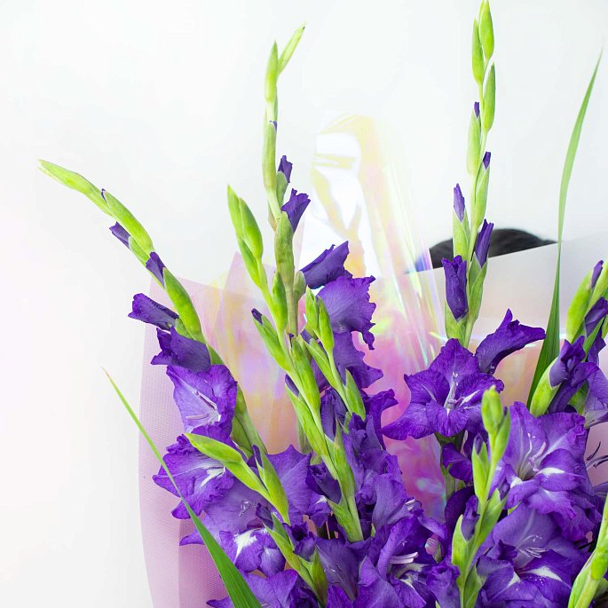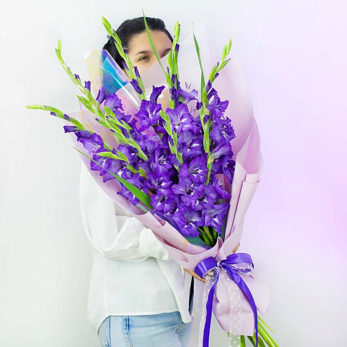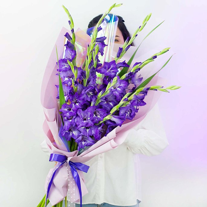 Букет из шикарных и крупных фиолетовых гладиолусов. Большой, стойкий букет с вау-эффектом и классной ценой!Примерный диаметр букета: 40 см