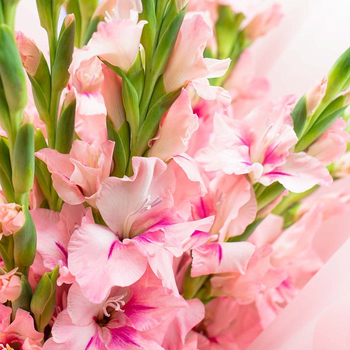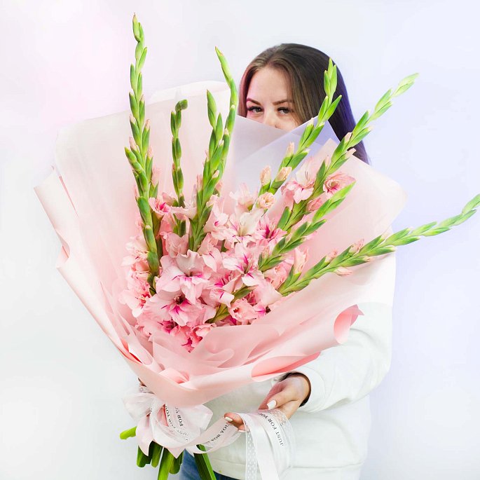 Высокие розовые гладиолусы смотрятся стильно и аккуратно. Лаконичная упаковка подчёркивает естественную красоту цветов.