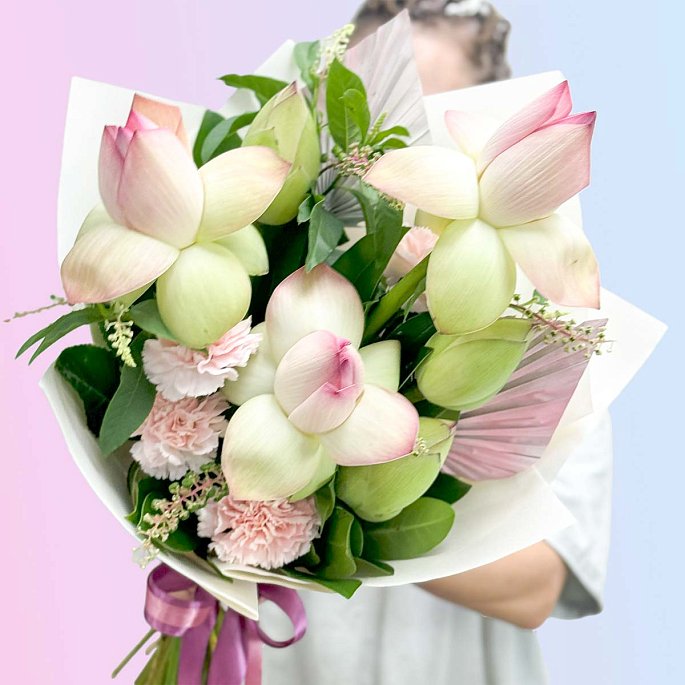 Этот букет с лотосами — это воплощение нежности и утончённости. Выберите его, чтобы порадовать близких и сделать любой день особенным!