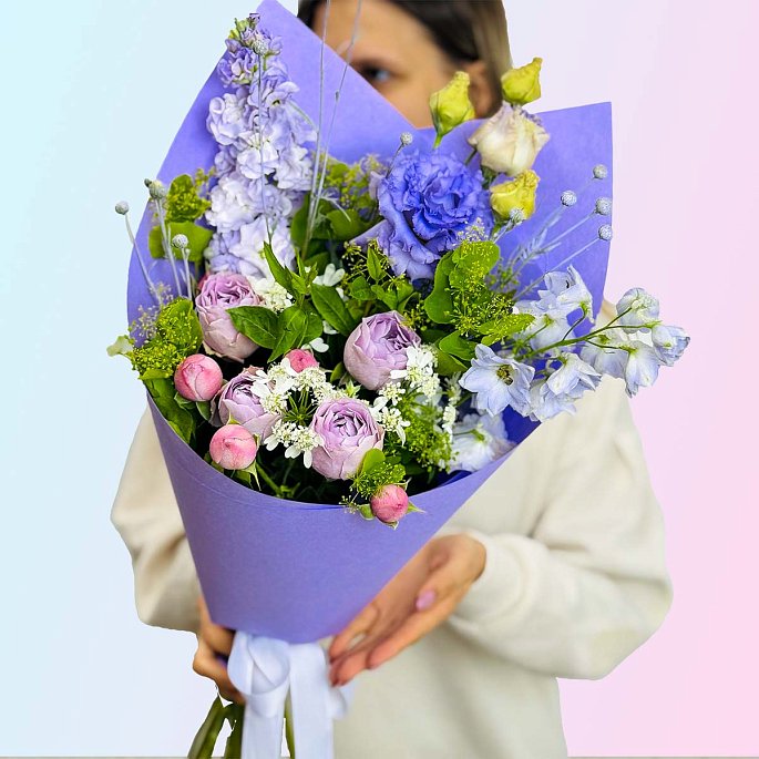 Небольшие розы, эустома, маттиола и сезонная зелень собраны в освежающий микс, который подойдёт для повседневного и приятного подарка.