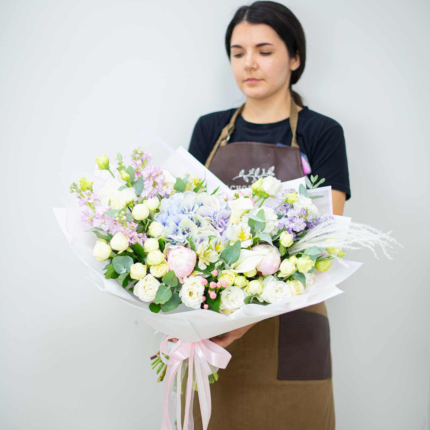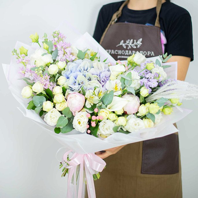 Легкий и очень воздушный букет в сочетании белых, нежно-голубых и розовых оттенков.Состав букета: