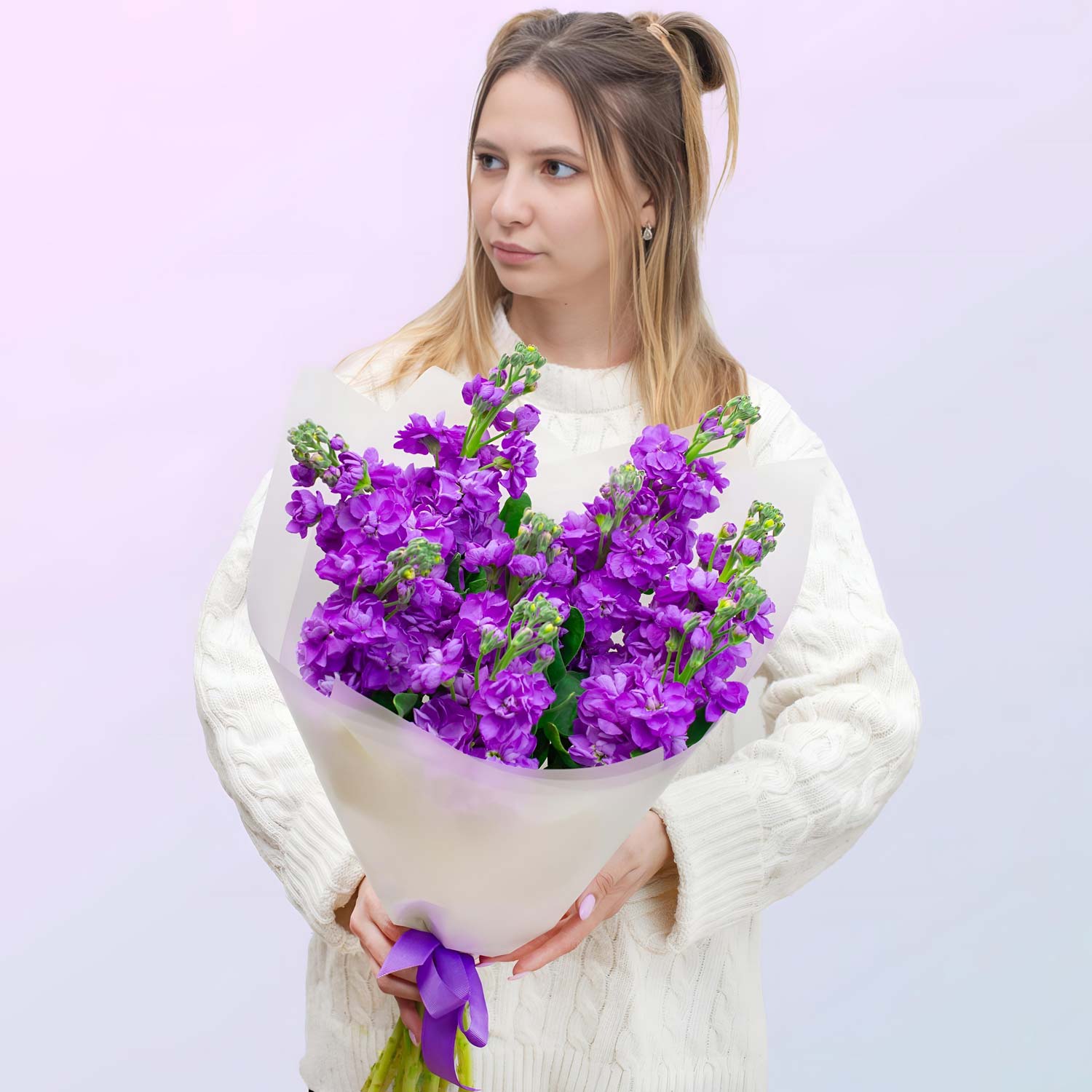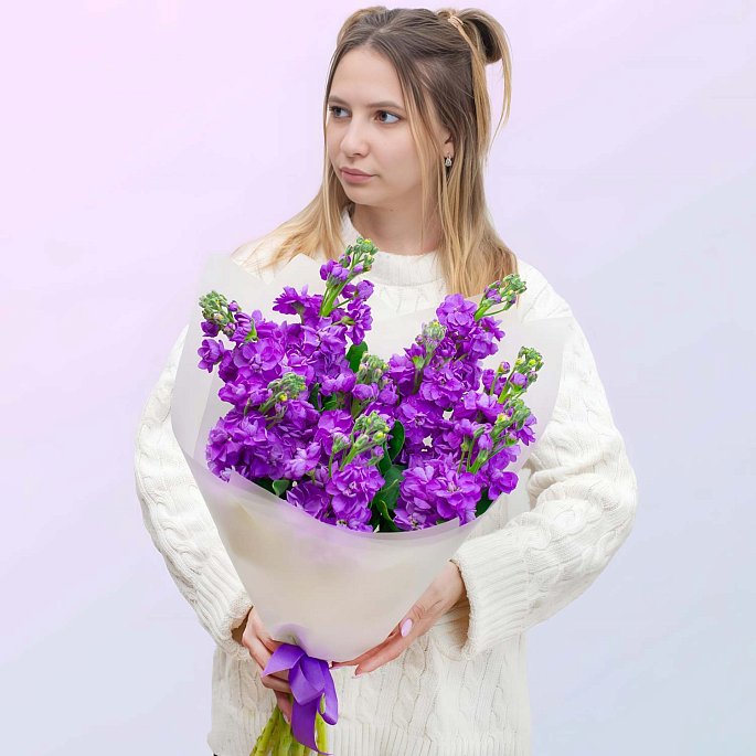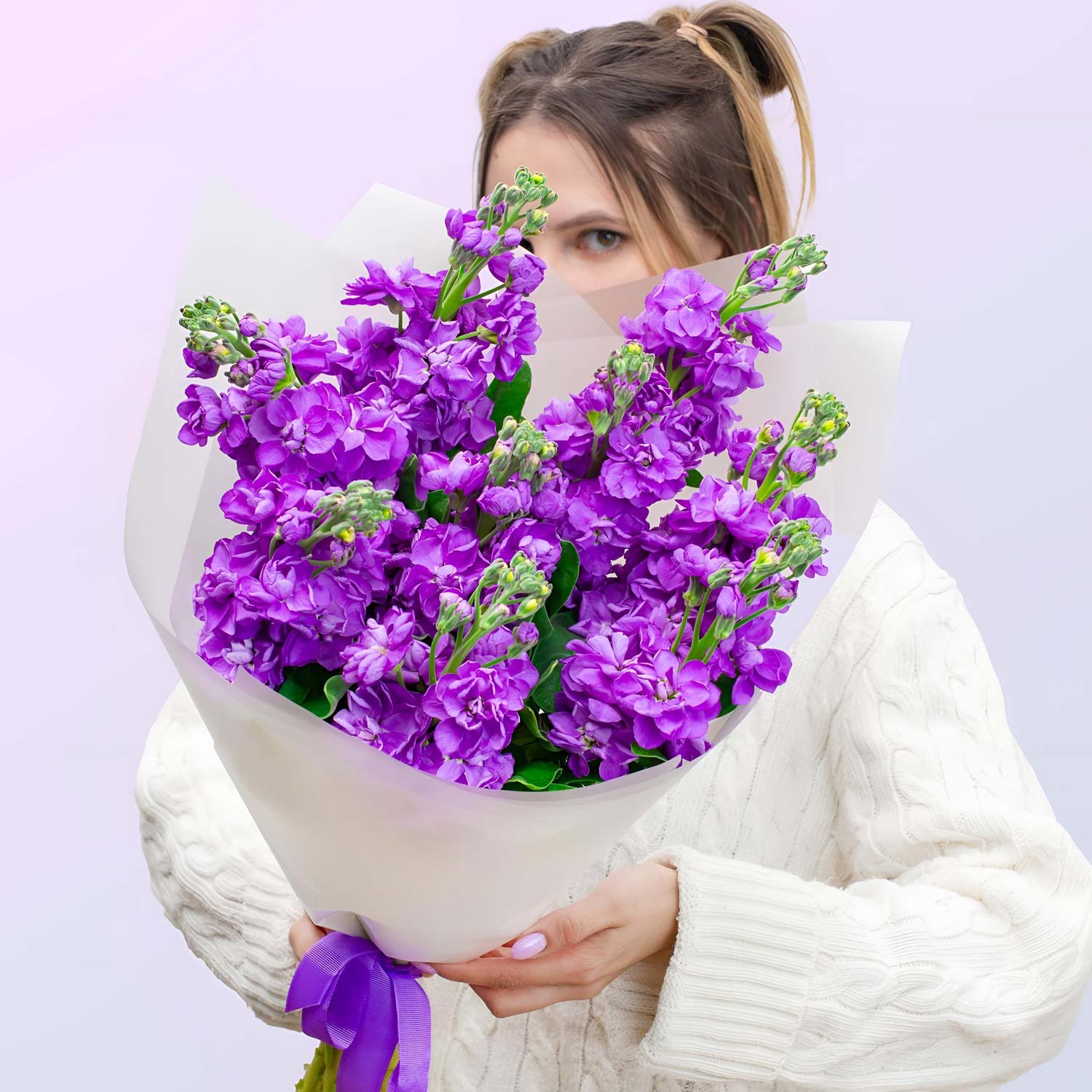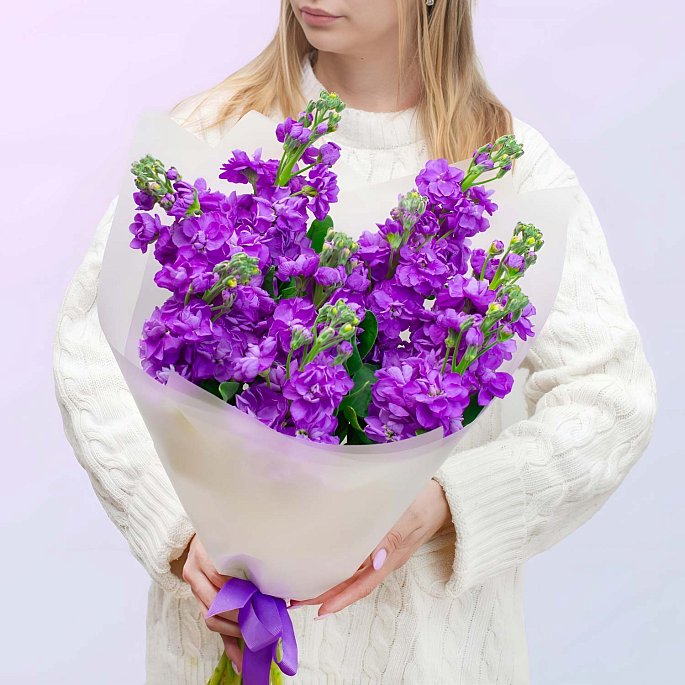 Фиолетовая маттиола — это не только красивый цветок, но и источник стойкого, пряного аромата. Композиция собрана лаконично и со вкусом: акцент на цветы, оформление — нейтральное и элегантное. Такой букет моментально привлекает внимание и создаёт атмосферу уюта.