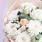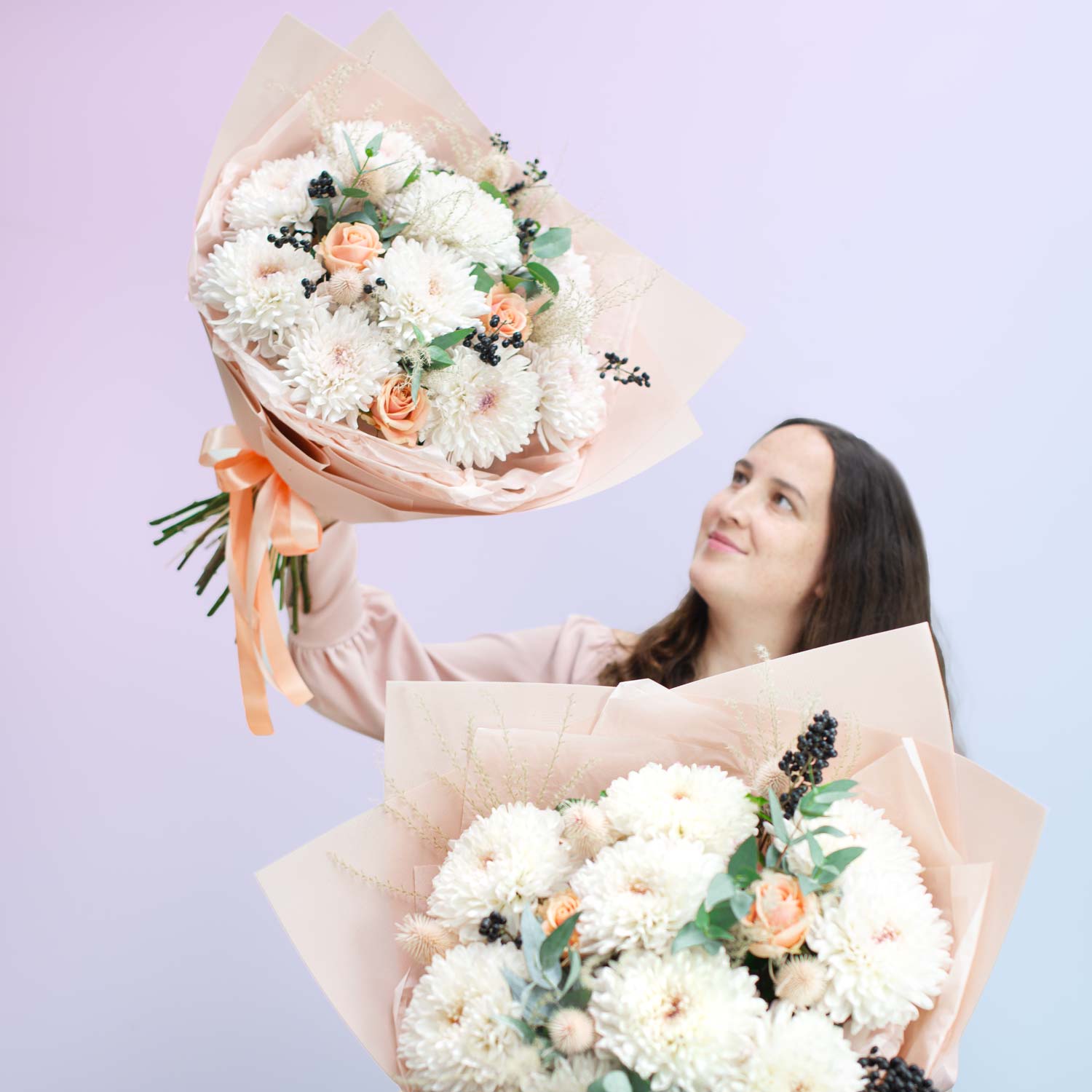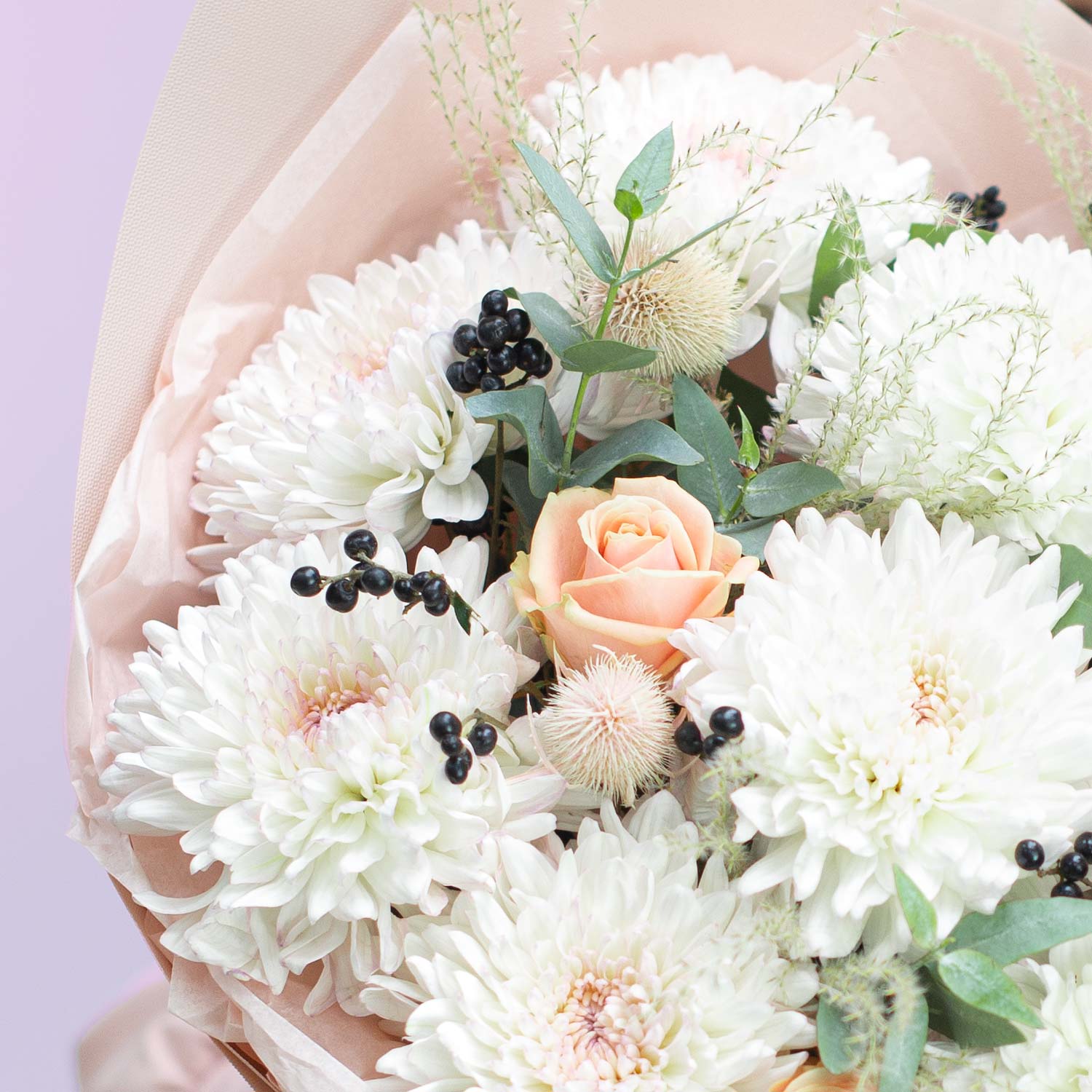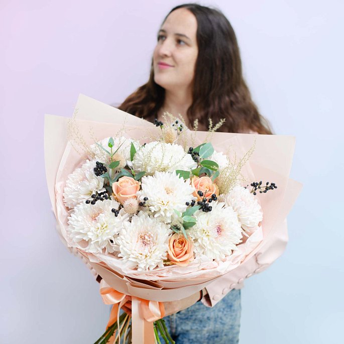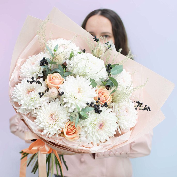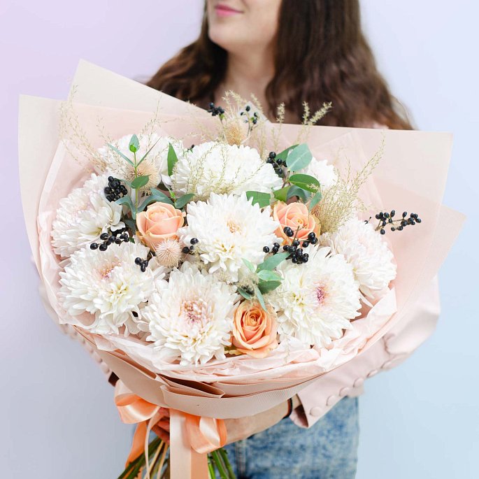 Букет из осенней коллекции в нежных бежевых тонах из сезонных хризантем с ягодами, декоративной зеленью и сухоцветами.Состав букета: