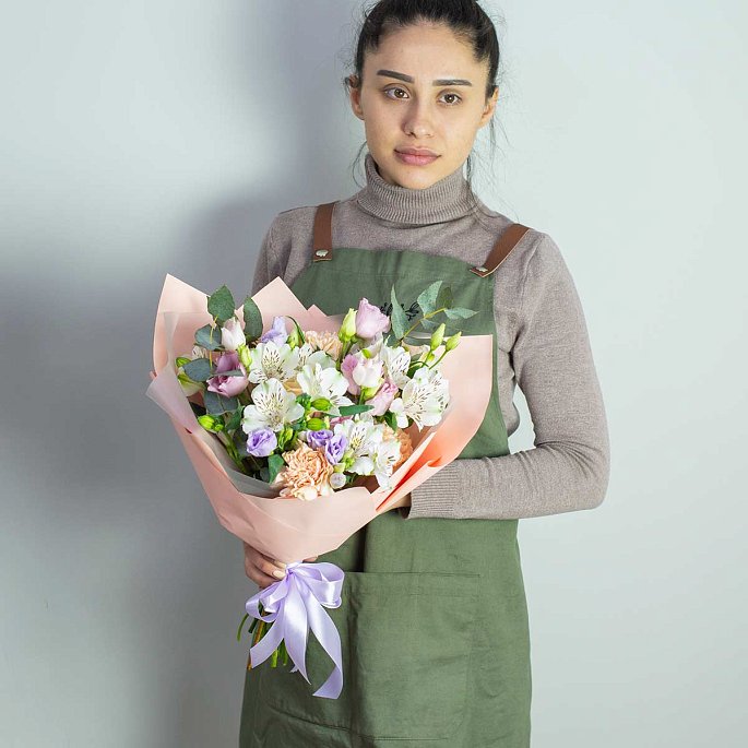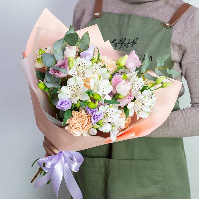 Букет в нежных тонах с эустомой, альстромерией, гвоздикой и розамиСостав букета: