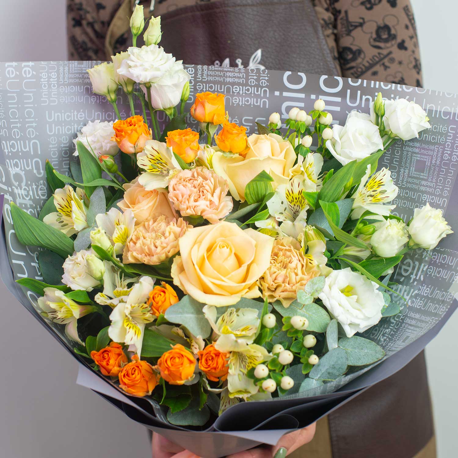 Легкий, воздушный букет в кремово-белых цветах с небольших акцентом светло-оранжевых ноток.Состав букета: